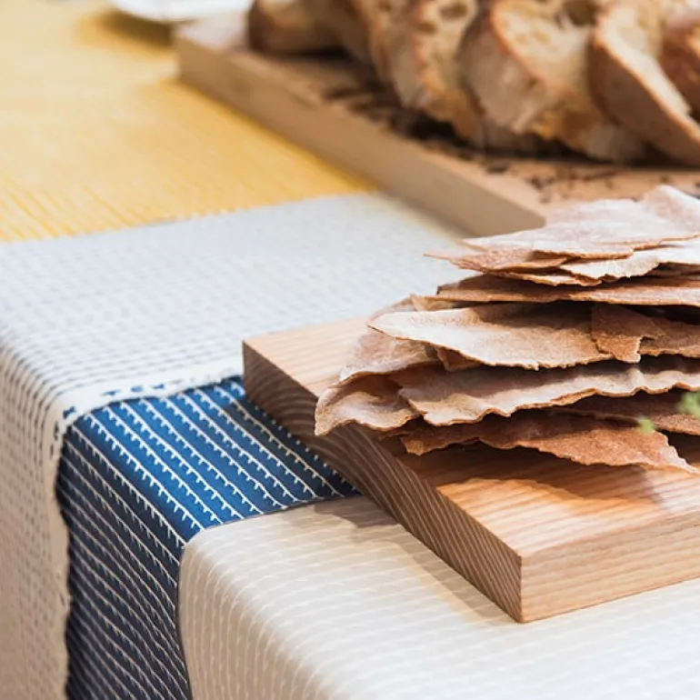 Attraktionskraften hos Rivi, som betyder “linje” på finska, ligger i de handmålade linjerna. Artek, med lång tradition av att skapa möbler i trä, ser de naturliga oregelbundenheterna som värdefulla i sig snarare än en brist. I Rivis hemkollektion ingår tyger, kuddfodral, brickor, necessärer och väskor i ett spektrum av nordiska färger.