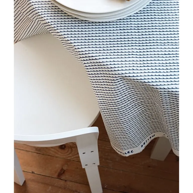 Rivi-tyget, designat av Ronan och Erwan Bouroullec för Artek, kännetecknas av sitt unika textilmönster, som består av rader med långa, parallella linjer och fina detaljer. Tyget är färdigskuret och tillverkat av akrylbehandlad bomull.