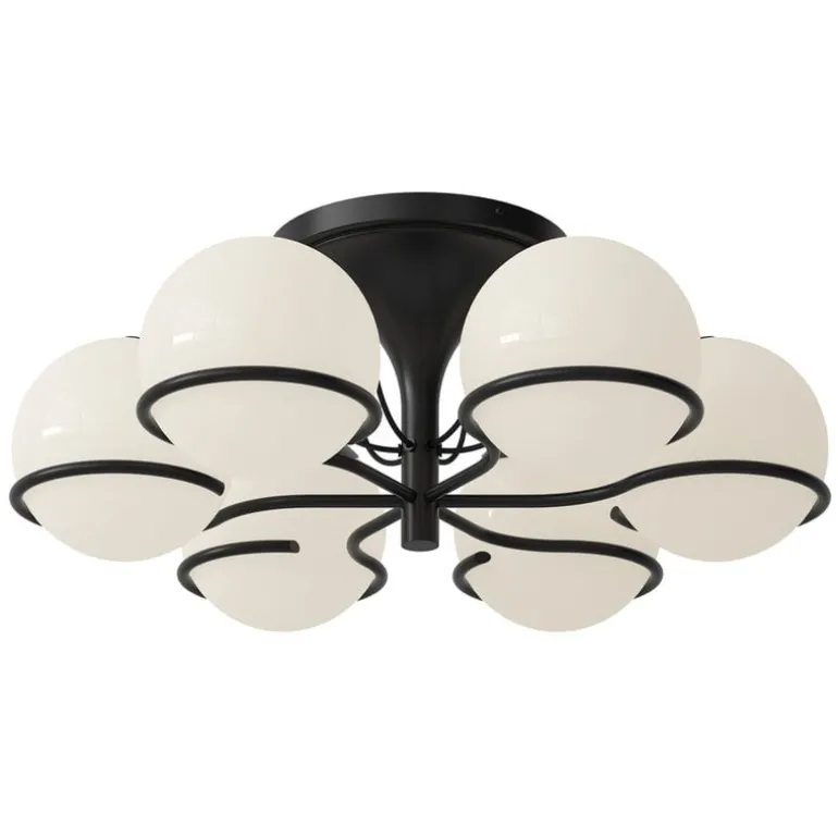 Taklampan Model 2042 från Astep är komponerad av sex klotformade skärmar i opalglas, omringade av stålringar. Du kan placera glaskloten på ringarna åt båda hållen och på så sätt förändra lampans utseende och ljusintensitet. Den djärva men strömlinjeformade Model 2042 kommer att hitta sin plats i många olika miljöer, oavsett om det är ett vardagsrum, hall, kök eller sovrum.