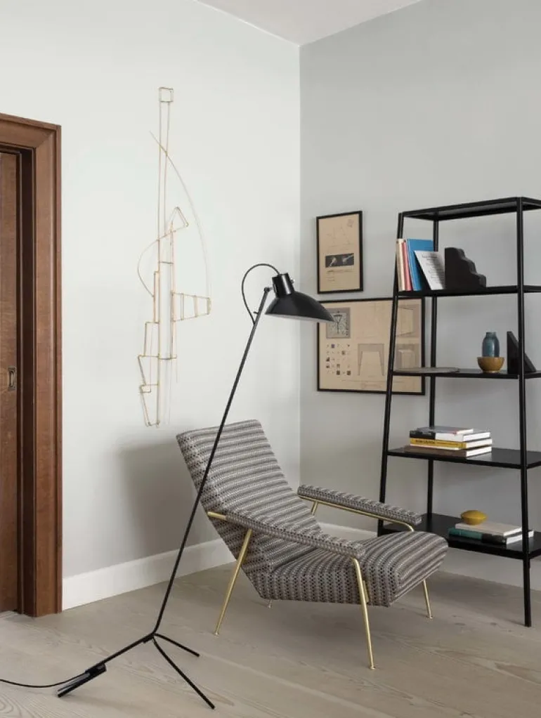 Golvlampan VV Cinquanta från Astep kombinerar en elegant trefotsbas med en strömlinjeformad skärm som både kan snurras och lutas. Golvlampan VV Cinquanta är en utmärkt ljuskälla bredvid en fåtölj, på kontoret eller som sänglampa.