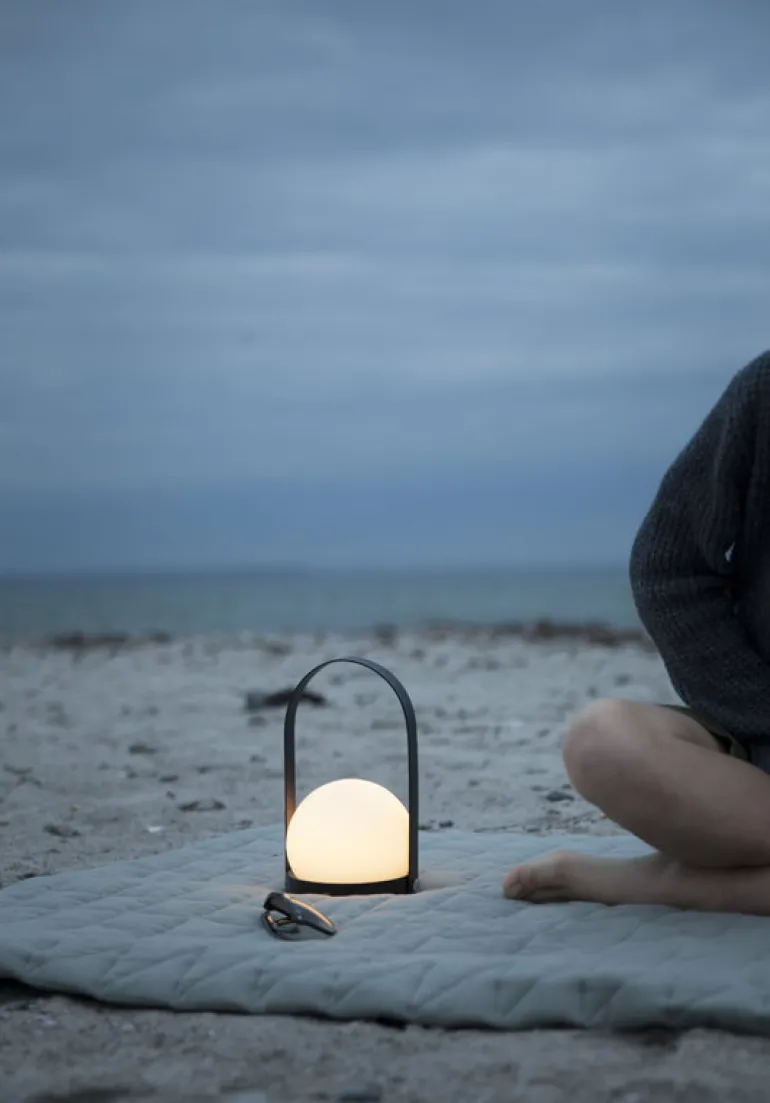 Audo Copenhagens bordslampa Carrie består av en vit glob i opalglas, en rund stålbas och ett avtagbart böjt handtag. Carrie, som designats av Norm Architects, är inte bara vacker utan väldigt funktionell: tack vare den uppladdningsbara LED-enheten kan den användas som sänglampa såväl som en bärbar ljuskälla till sommarstugan, picknicken eller kvällspromenader på stranden. Den dimbara lampan som liknar en lykta är perfekt för att skapa en mysig atmosfär – det som danskarna kallar för hygge. Lampan kan även användas utomhus i torra förhållanden.