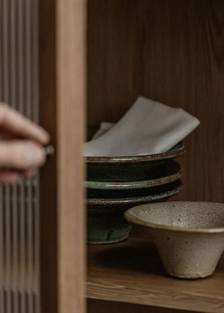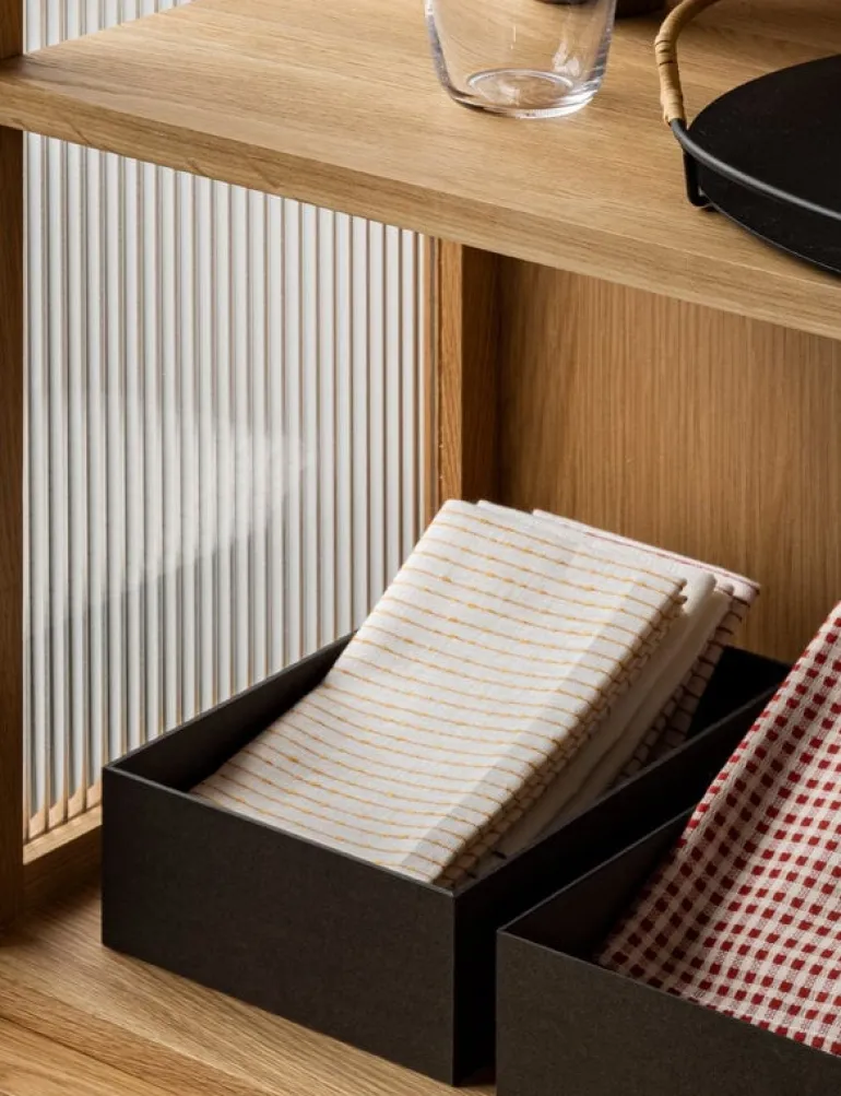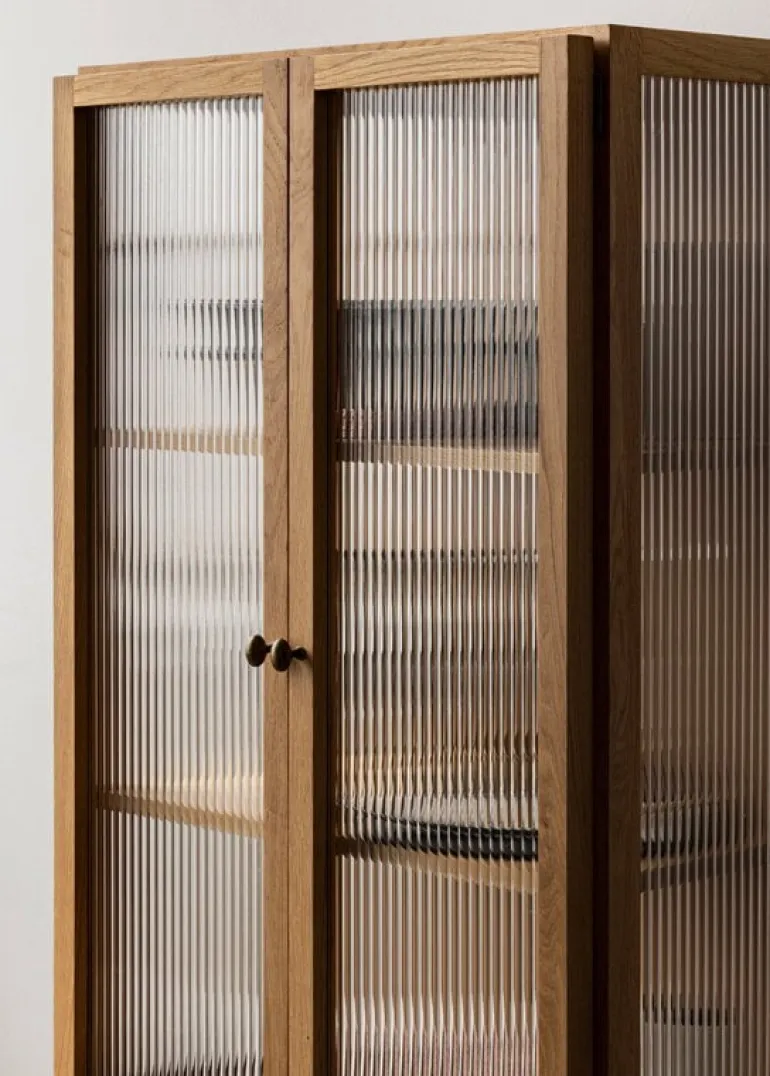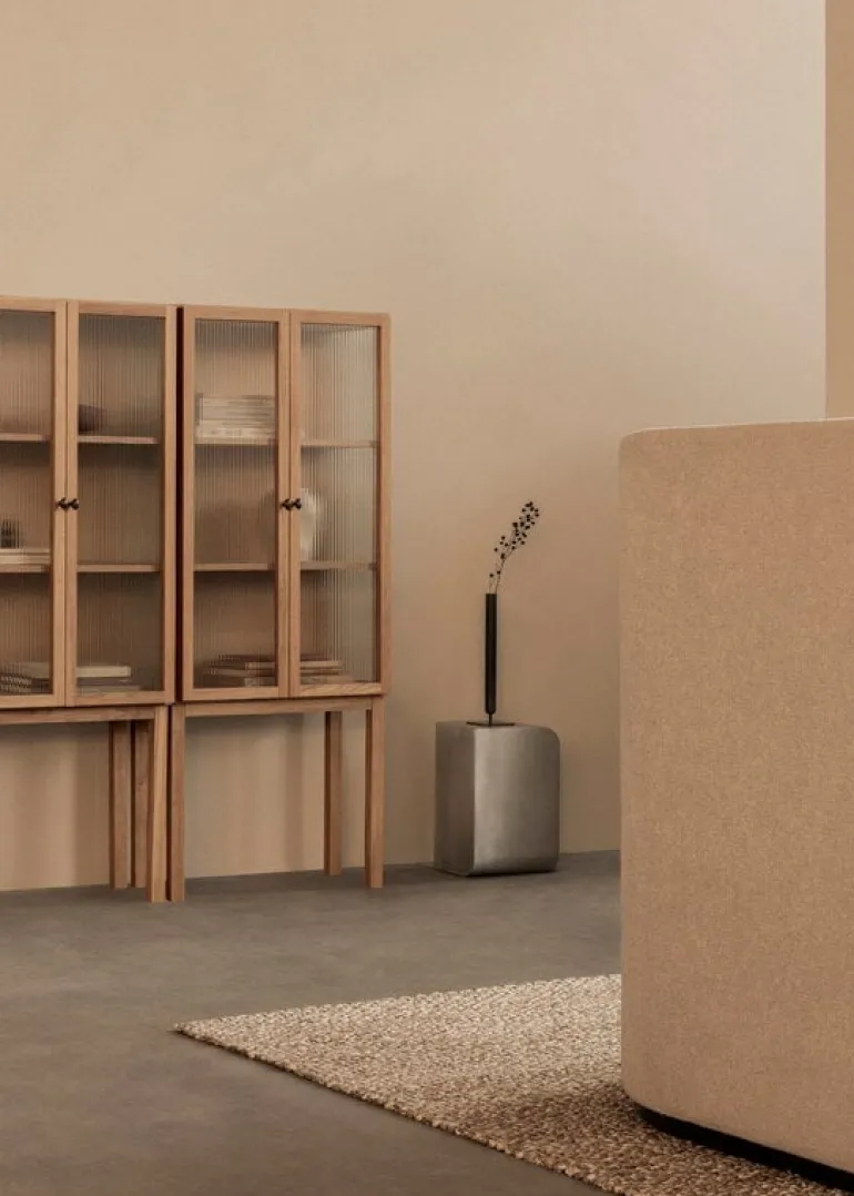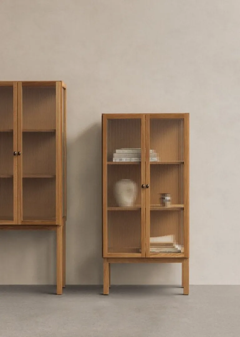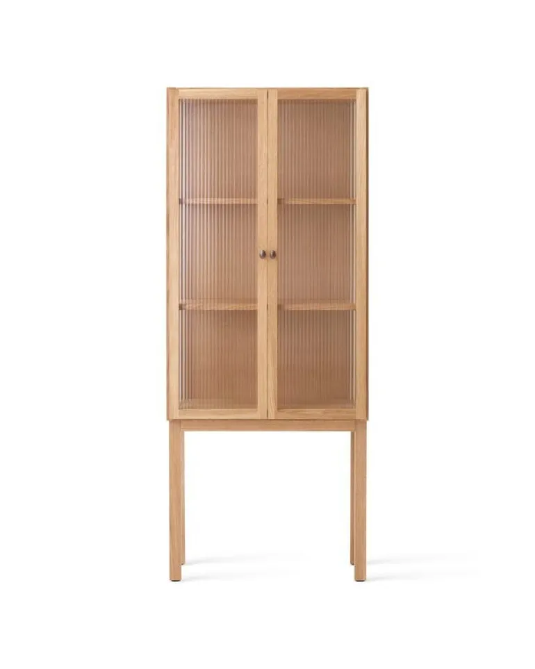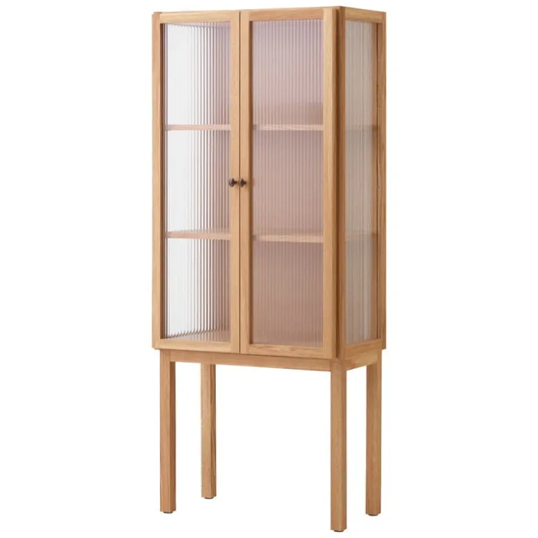 Audo Copenhagens Curiosity skåp är Mentze Ottensteins charmiga tolkning av ett klassiskt vitrinskåp. Skåpet är tillverkat med intrikata fogar och har en robust ram och ben i massiv ek för en stadig struktur, medan de räfflade glasdörrarna döljer innehållet på ett diskret sätt. Bakom glasdörrarna hittar du två hyllplan i ekfanér som kan justeras för att passa dina önskemål. Skåpet Curiosity är perfekt för förvaring av porslin, vaser och andra ömtåliga föremål i köket eller vardagsrummet, men det är också en vacker bokhylla för kontoret. Handtag och gångjärn i mässing ger en tidlös och elegant finish.