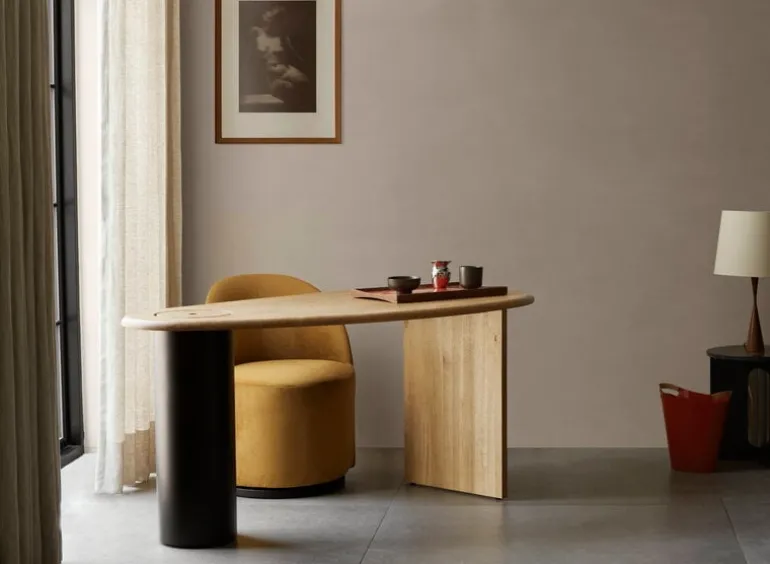 Utöver den unika toppen så har skrivbordet asymmetriska ben som även de är rätt ovanliga: bordsskivan vilar på ett brett träben och en stålkolumn som samtidigt har dubbel funktion som förvaringsutrymme för en kabel till en bordslampa, till exempel. Detaljerna hjälper inte bara bordet att sticka ut ur mängden, det gör även att det är enklare att hålla bordet rent och städat så att du kan fokusera på arbete istället för oordning. ”Jag vill att människor ska känna sig inspirerade när de sitter vid bordet. Luta dig tillbaka och rör vid den böjda kanten, finn lugnet inom dig och fokusera på jobbet”, har Rigby sagt.