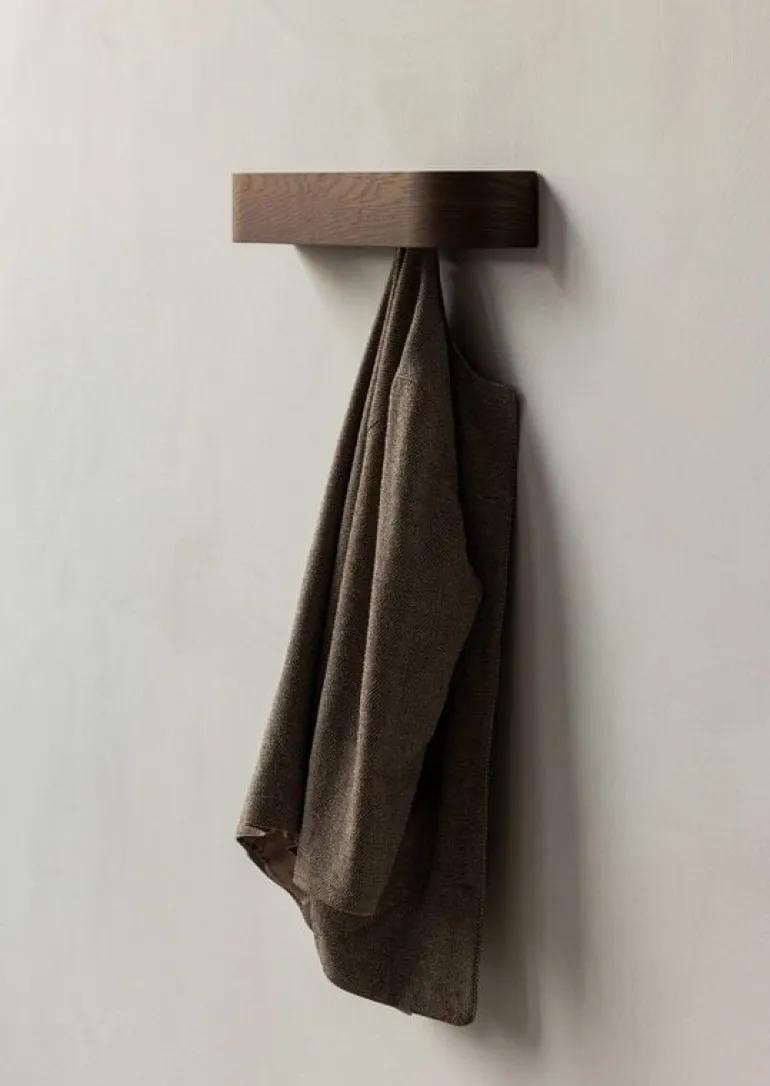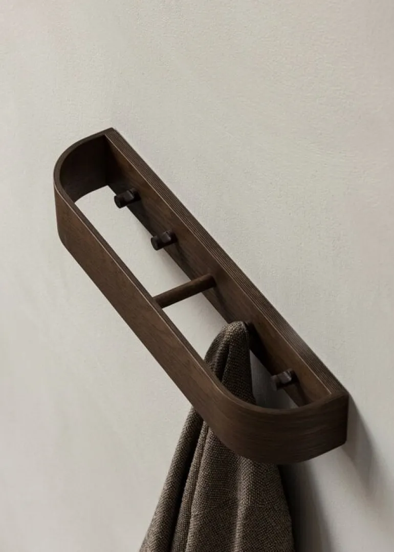 Klädhängaren Epoch från Audo Copenhagen har en elegant design som betonar både form och funktion. Designad av Nina Bruun, har klädhängaren sina krokar dolda bakom en mjukt böjd trälist, vilket ger rummet en känsla av lugn och ro – entrén är ofta inte det mest ordnade utrymmet. Hyllan är tillverkad av fanerad plywood i ek, där träets naturliga värme och den böjda designen förstärker klädhängarens lugna intryck.