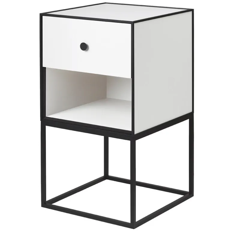 Sidobordet Frame, från Audo Copenhagen, består av en kubformad förvaringsbox med en låda på en enkel piedestal av metall. Den minimalistiska byrån är del av By Lassens klassiska förvaringssystem Frame, vilket kännetecknas, liksom resten av kollektionen, av svarta metallramar som ger den i övrigt nedtonade designen en fin kontrast.