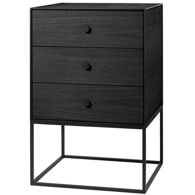 Byrån Frame, från Audo Copenhagen, består av en kubformad förvaringsbox med tre lådor på en enkel piedestal av metall. Den minimalistiska byrån är del av By Lassens klassiska förvaringssystem Frame, vilket kännetecknas, liksom resten av kollektionen, av svarta metallramar som ger den i övrigt nedtonade designen en fin kontrast.