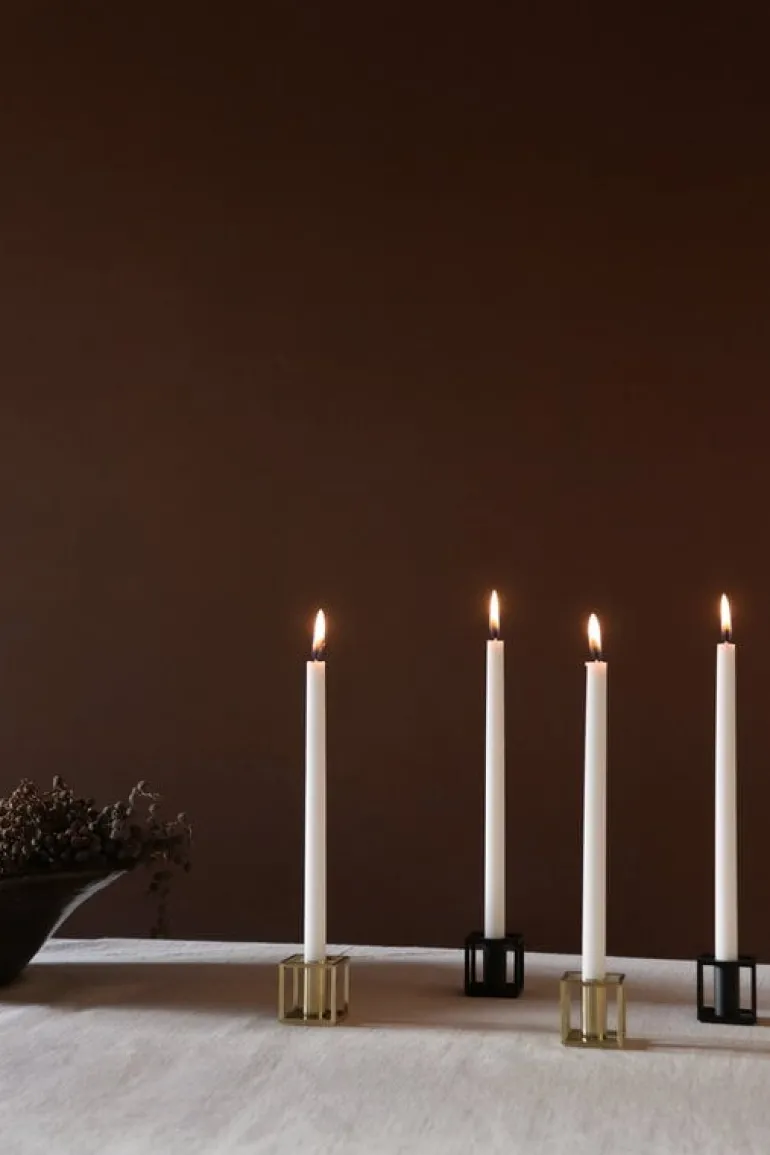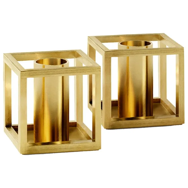 Audo Copenhagens Kubus Micro är en miniversion av den klassiska Kubus-ljushållaren, formgiven av danske arkitekten och formgivaren Mogens Lassen. När Lassen skapade den ursprungliga designen 1962, hämtade han inspiration från Bauhausskolan, vilket kan ses i den här ljushållarens vackra, geometriska design. Geometrin för Kubus Micro är exakt densamma, fast förminskad till halva storleken av den klassiska ljushållaren Kubus 1. Förpackningen innehåller två guldpläterade ljushållare.