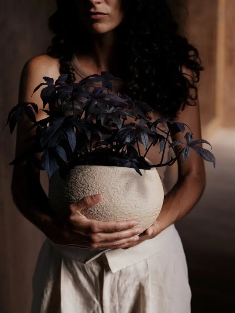 Audo Copenhagens blomkruka Plantas är en unik vas som ändrar form beroende på från vilket håll du beundrar den. Blomkrukans charmiga karaktär kommer av dess mjuka, böljande kurvor i kombination med ytan av oglaserat stengods – den skrovliga texturen står i iögonenfallande kontrast till de ömtåliga växterna och blommorna som planterats i krukan. Blomkrukan Plantas är tillverkad för hand, vilket gör att utförandet för varje kruka bara blir än mer unikt.