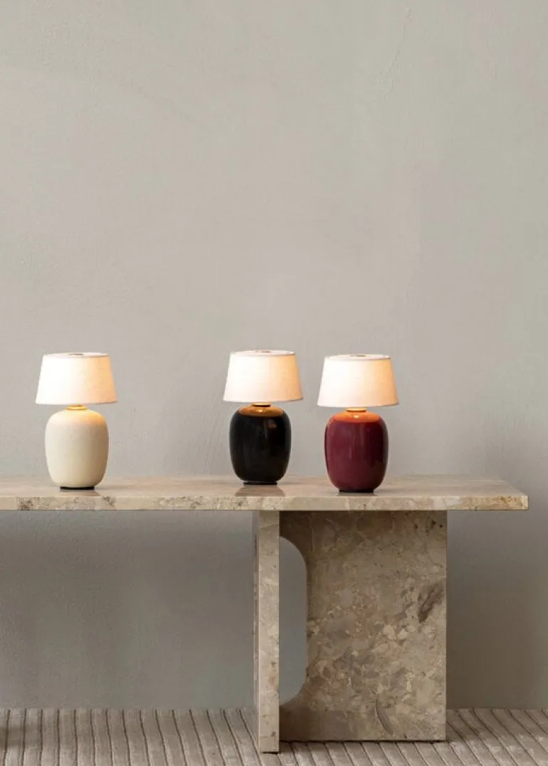 Torso Portable är en sladdlös bordslampa som är lätt att placera var som helst du vill, till exempel på matbordet eller i ett rum utan elektricitet. Lampan laddas med en USB-kabel och är också kompatibel med Audo Copenhagen Charging Board. För längre batterilivslängd rekommenderas det att stänga av lampan när den laddas och inte att lämna den inkopplad medan den används.