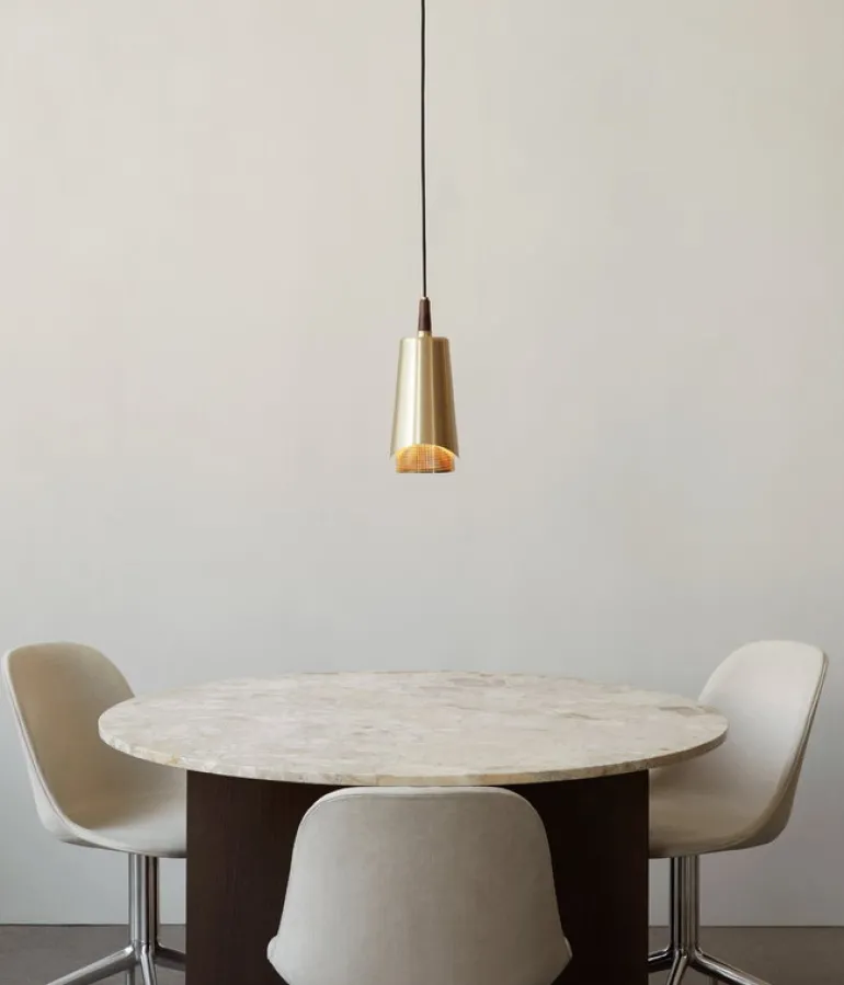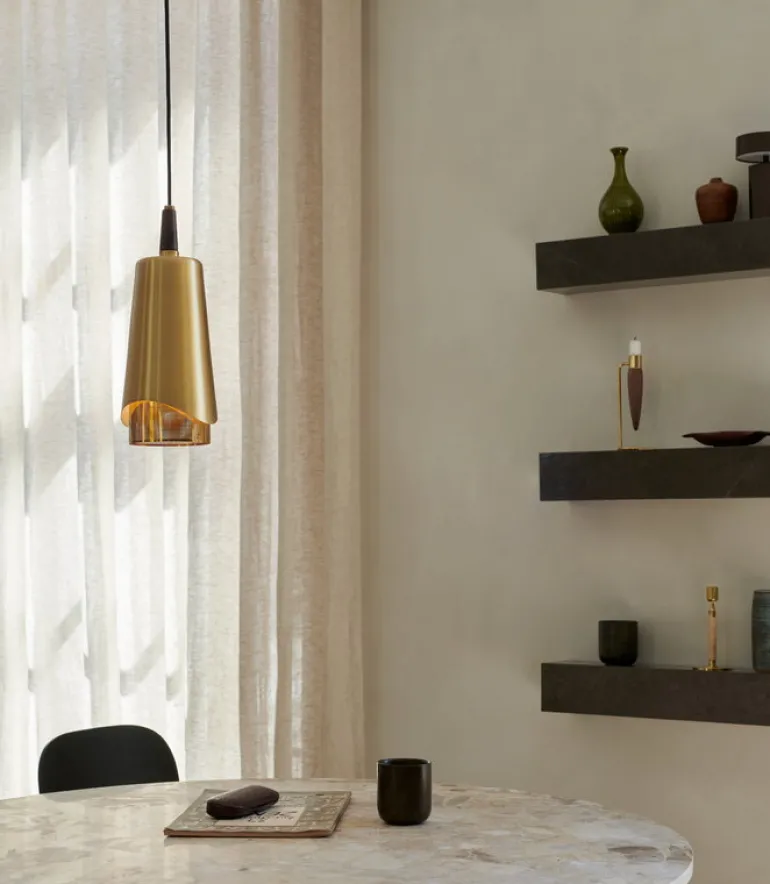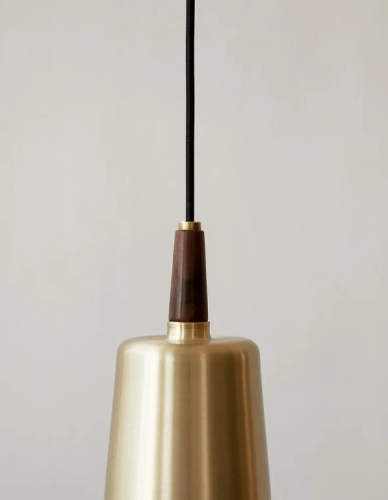 Pendellampan Umanoff, från Audo Copenhagen och med design av Arthur Umanoff, kännetecknas av både sin skönhet och funktionalitet. Lampan består av geometriska delar i valnöt och mässing som tillsammans skapar en skulptural design. Pendellampan lyser med ett mjukt sken nedåt och passar perfekt över middagsbordet eller i en mysig läshörna.