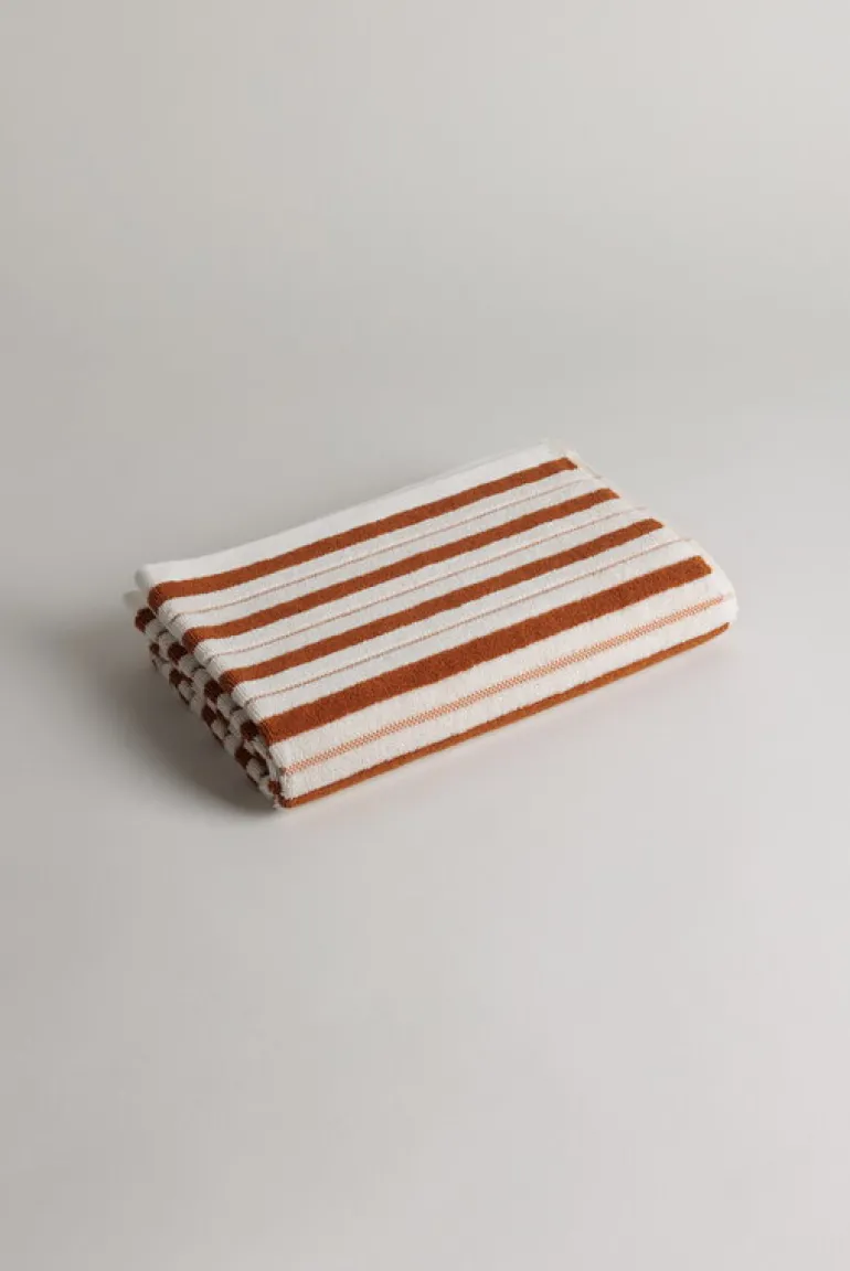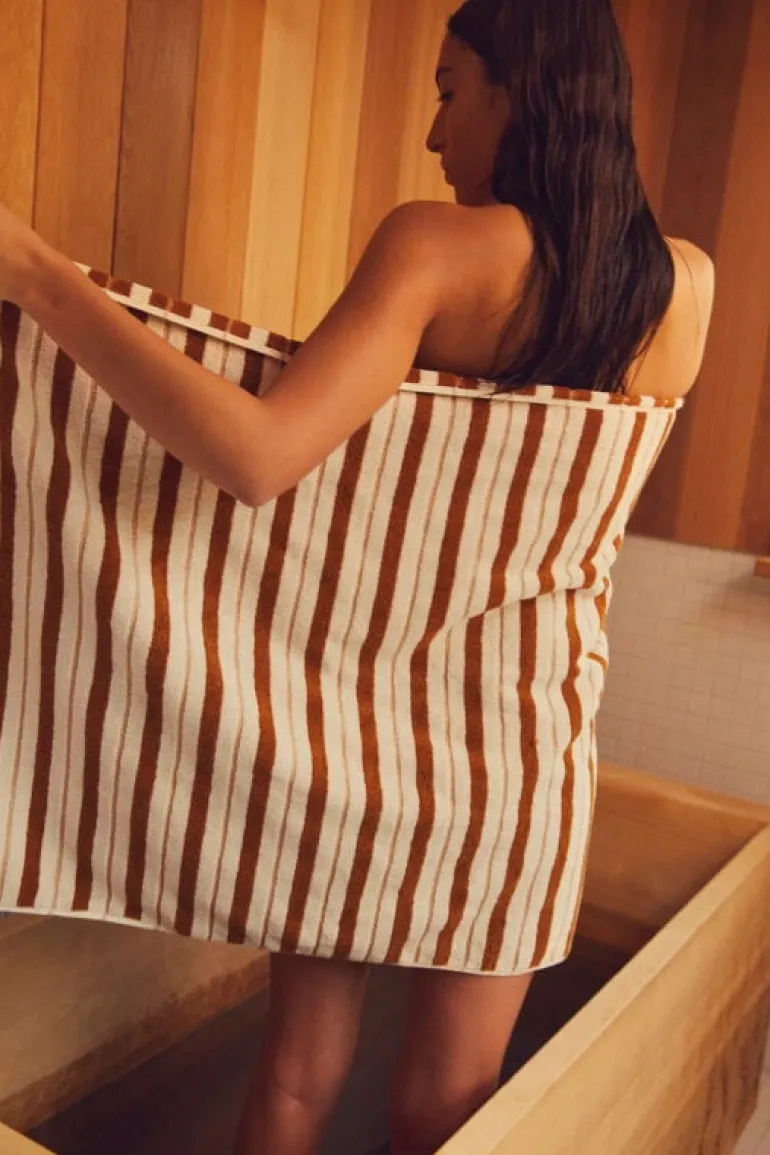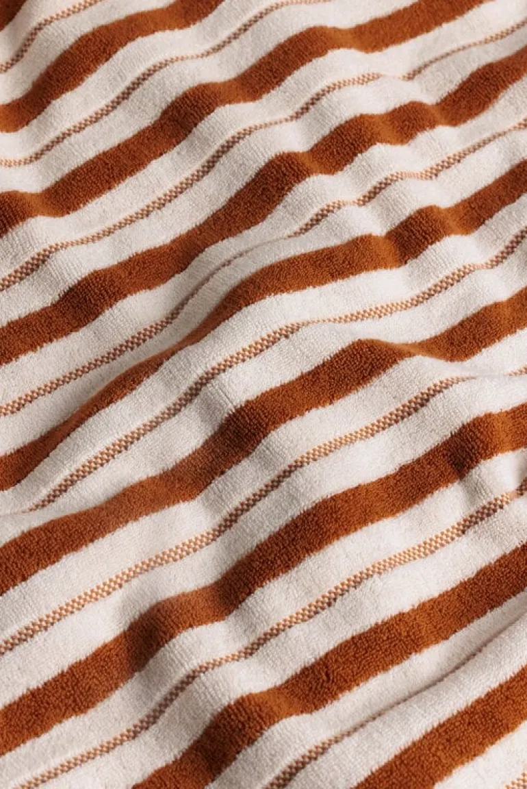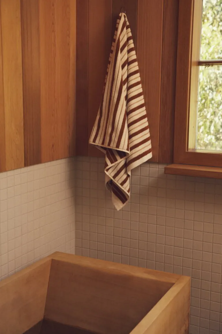 Badlakanet Franklin från Baina har ett fräscht tvåtonat randmönster med växlande tjocka vävda ränder och små schackrutemönster. Mönstret speglas på baksidan i motsatta nyanser. Badlakanet är tillverkat i tjock, ekologisk bomull och har en perfekt balans mellan absorberingsförmåga, mjukhet och snabb torktid.