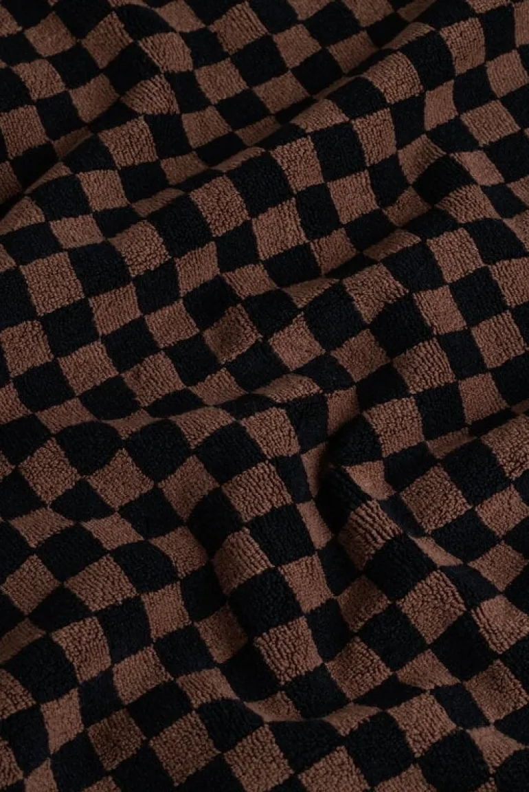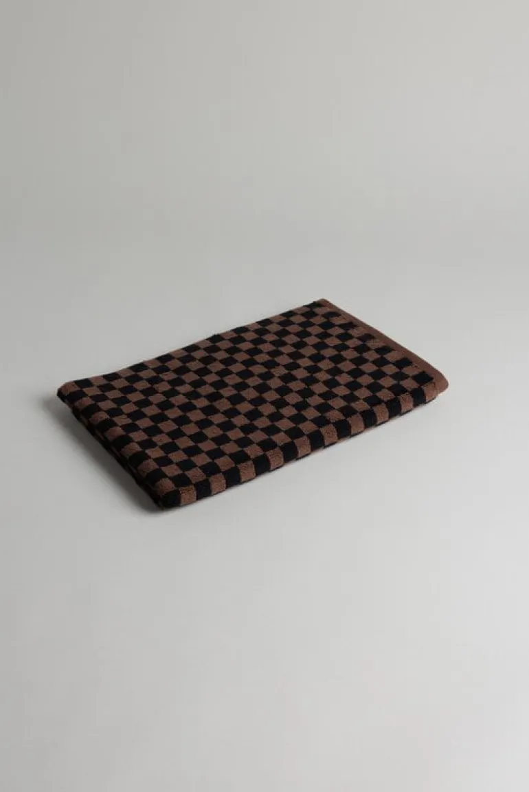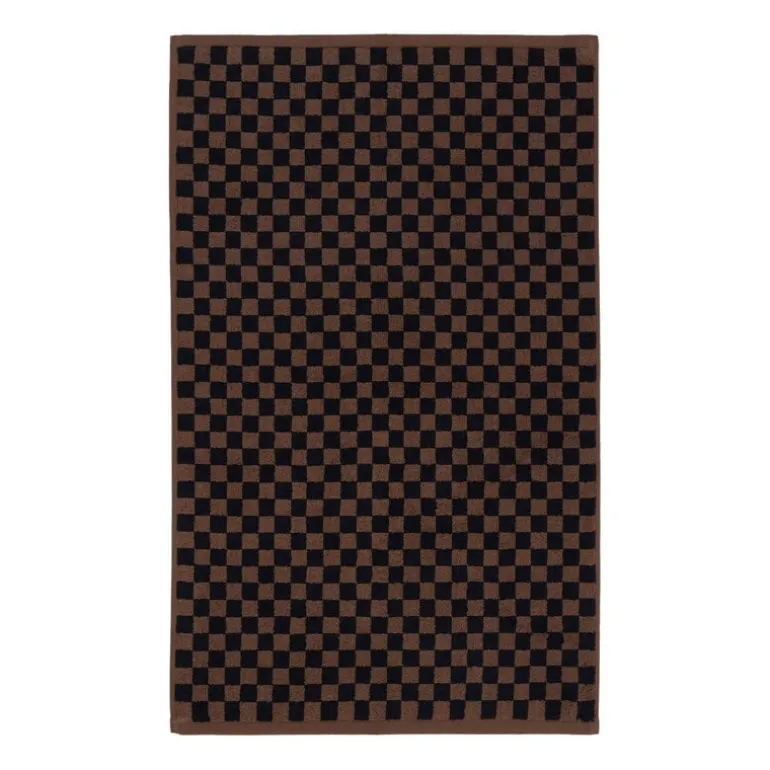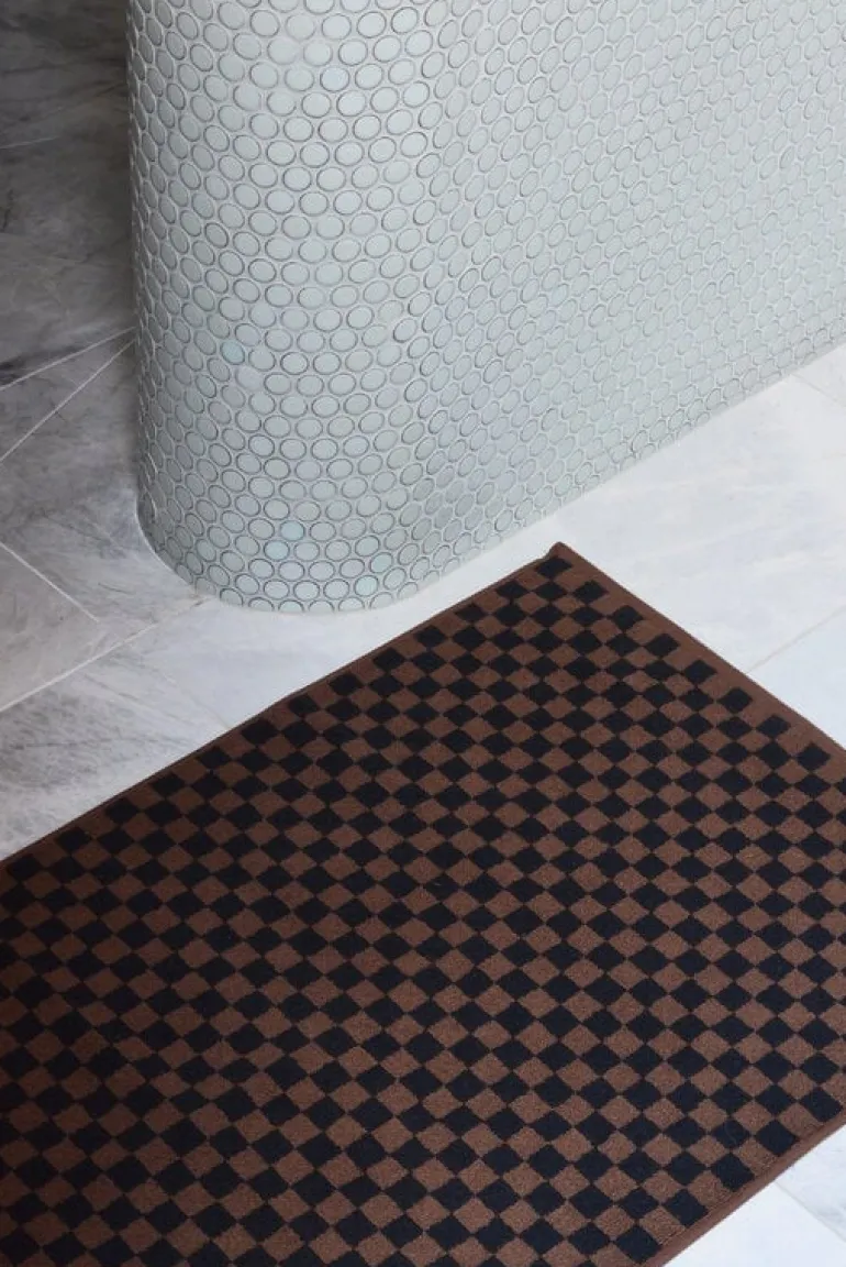 Badmattan Beppu från Baina har ett klassiskt tvåtonat schackmönster som utstrålar en lyxig nostalgisk charm. Den är tillverkad av tätt vävt, högt absorberande ekologisk bomullsfrotté och känns underbart mjuk mot dina bara fötter.