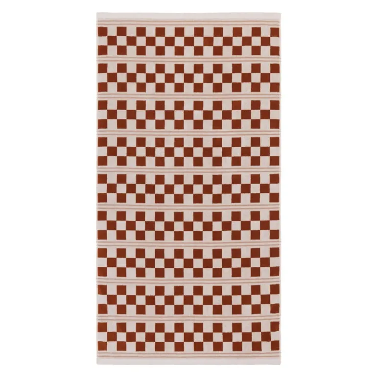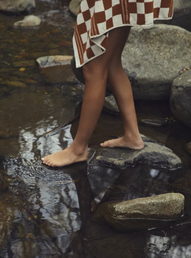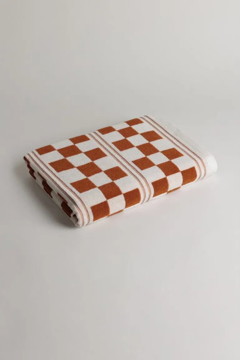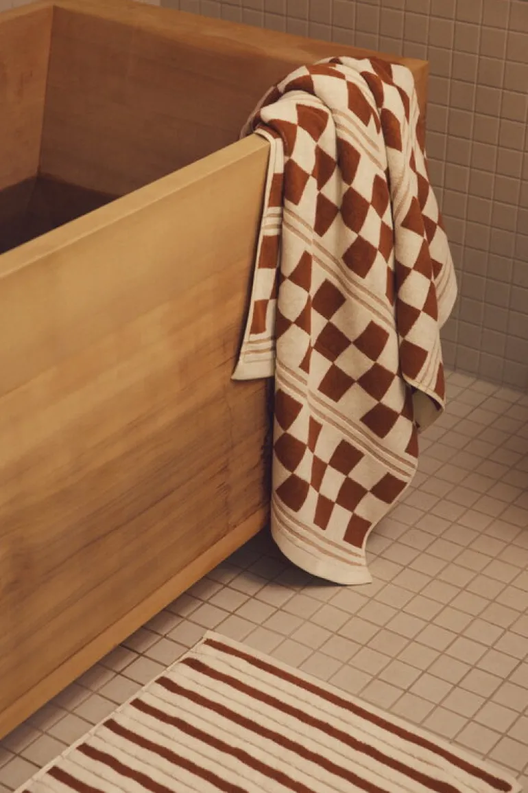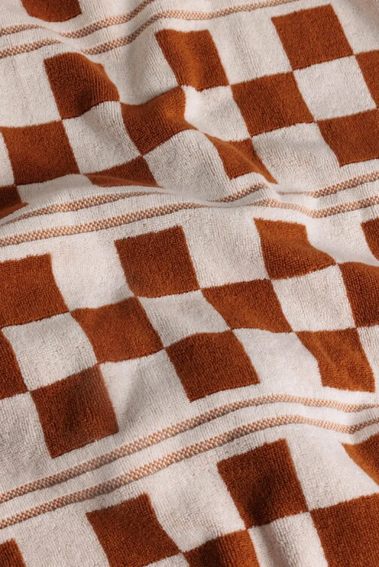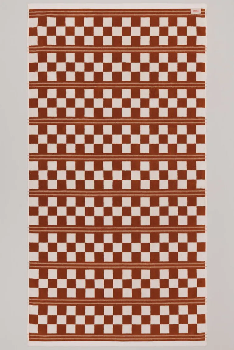 Strandhandduken Busby från Baina har ett fräscht tvåtonat rutmönster med växlande stora vävda schackbräden och smala randiga broderier. Mönstret speglas på handdukens baksida i motsatta nyanser. Strandhandduken är tillverkad i tjock, ekologisk bomull som uppnår en perfekt balans mellan absorberingsförmåga, mjukhet och snabb torktid. Den stora handduken är perfekt att svepa in sig i efter ett dopp, oavsett om det är vid poolen eller på stranden.