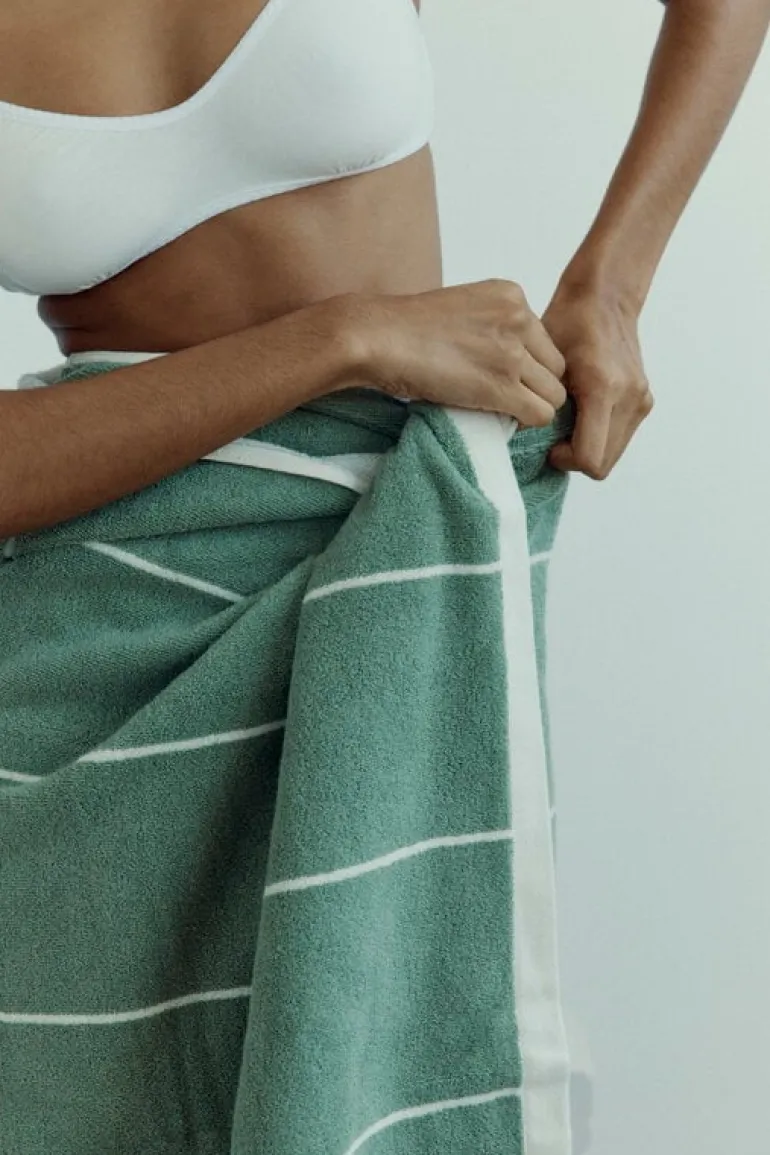 Strandhandduken Miles från Baina har ett fräscht tvåtonat rutmönster med växlande vertikala vävda ränder och små, rutstickade horisontella ränder. Mönstret speglas på båda sidor i motsatta nyanser. Strandhandduken är tillverkad i tjock, ekologisk bomull som ger en perfekt balans mellan absorberingsförmåga, mjukhet och snabb torktid. Den stora handduken är perfekt att svepa in sig i efter ett dopp, oavsett om det är vid poolen eller på stranden.