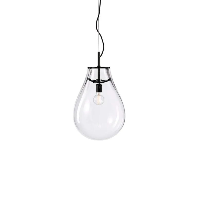 Bommas pendellampa Tim fångar blicken med sin slående enkelhet och djärva närvaro. Den överdimensionerade formen, i kontrast till den lilla glödlampan, skapar en fängslande visuell balans, som ytterligare förstärks av de svarta inslagen som tillför djup och harmoniska detaljer. Hantverket bakom den munblåsta kristallglaset framhäver den otroliga skicklighet och precision som krävts för att uppnå en så till synes enkel design. Oavsett om den visas upp på egen hand eller som en del av en glittrande klunga, så lyser pendellampan Tim upp som en fantastisk fokuspunkt i alla interiörer.