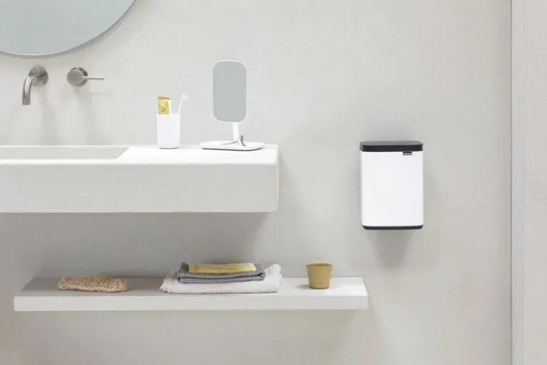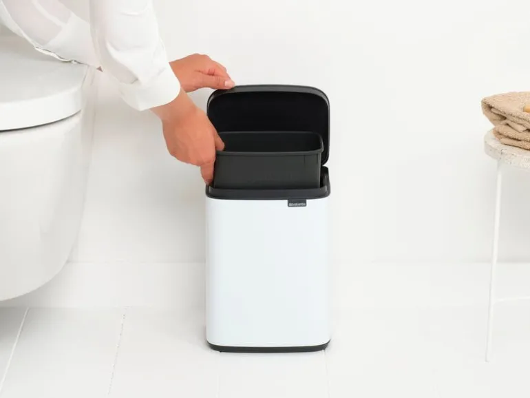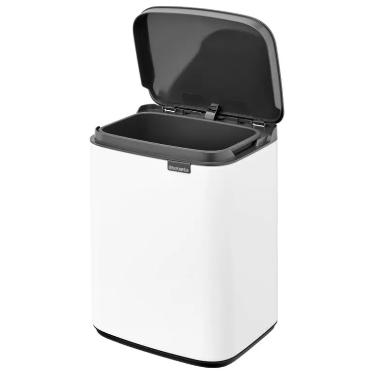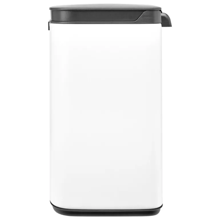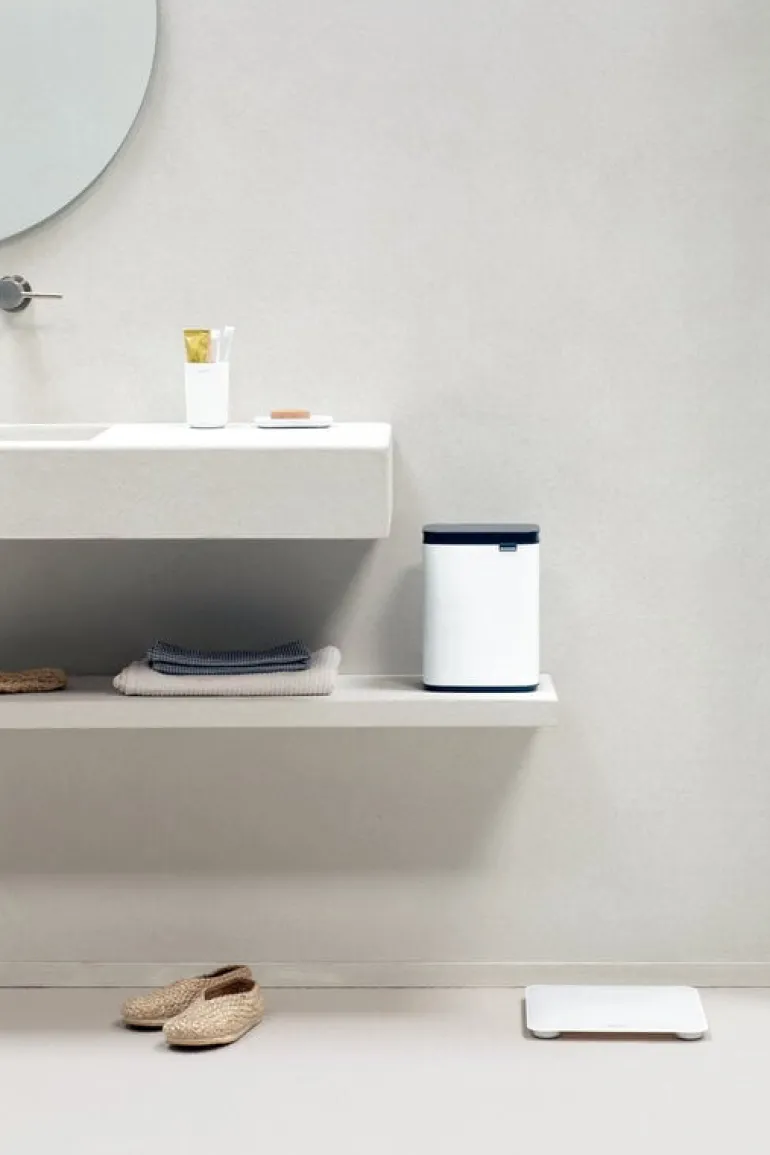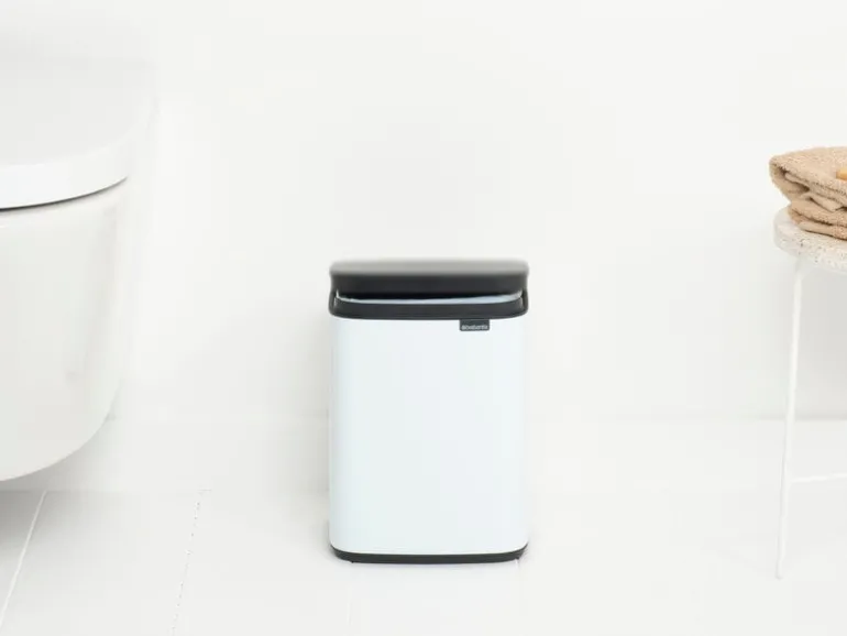 Brabantias Bo Waste Bin är en vacker och funktionell avfallslösning för hushållet – den här kompakta papperskorgen kan antingen placeras på golvet eller monteras på väggen, exempelvis i badrummet eller i köket. Papperskorgen är tillverkad i ytbehandlat stål, som är både elegant och tåligt. Den är utrustad med innerbehållare, transporthandtag och ett lock med mjuk stängningsmekanism, och den kan dessutom öppnas från vänster, höger eller framifrån. Tack vare sin rektangulära form kan Bo Waste Bin enkelt ställas intill väggen, och med de halkfria benen står behållaren stadigt, samtidigt som de skyddar golvet. Papperskorgarna i Bo-kollektionen har certifierats med Cradle to Cradle på bronsnivå. De tillverkas i Belgien och garantin gäller i 10 år.