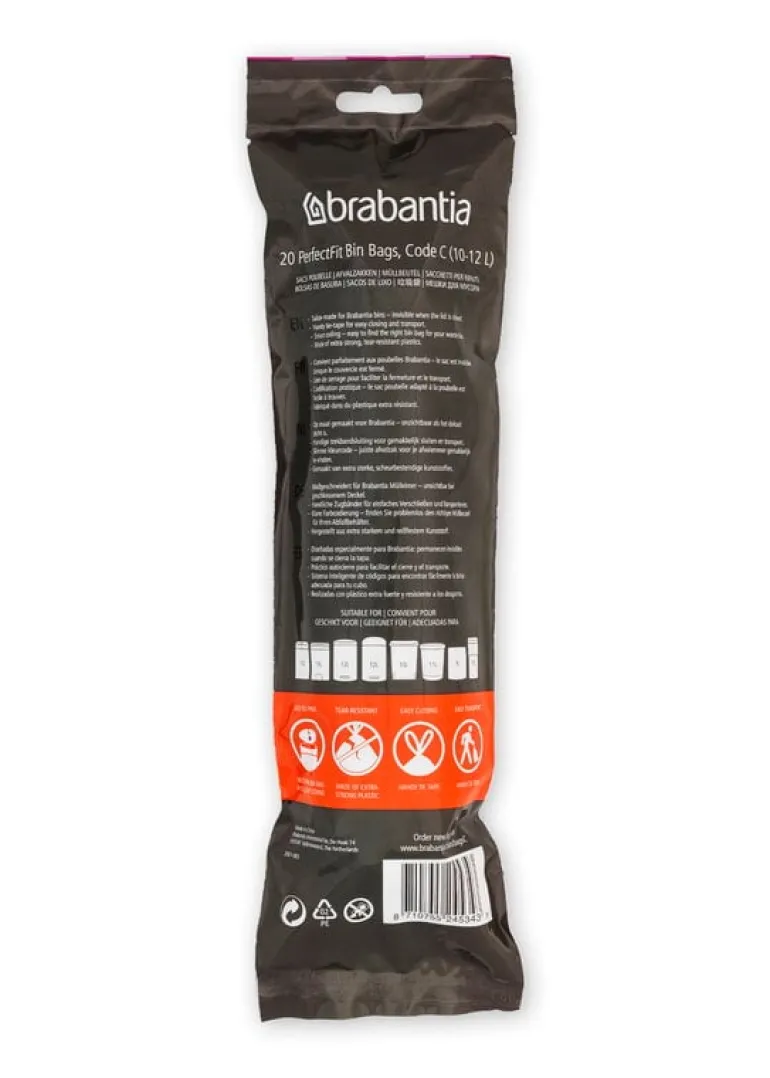 Soppåsarna PerfectFit från Brabantia är specialdesignade för att passa till varumärkets papperskorgar. Soppåsarna är tillverkade av stark HDPE-plast med integrerat knytband, så att du kan försluta och bära bort påsarna på ett enkelt sätt utan att bli smutsig. Välj rätt storlek genom att använda bokstavskoden som finns under locket på din Brabantia-papperskorg.