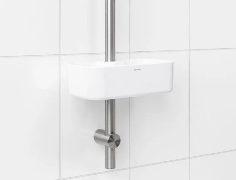 Duschhyllan ReNew från Brabantia håller schampo och duschtvål inom räckhåll. Hyllan är enkel att montera på duschstången vid önskad höjd och håller upp till 2 kg – så du kan ha flera flaskor i den! Duschhyllan har hål i botten som förhindrar ansamling av vatten.
