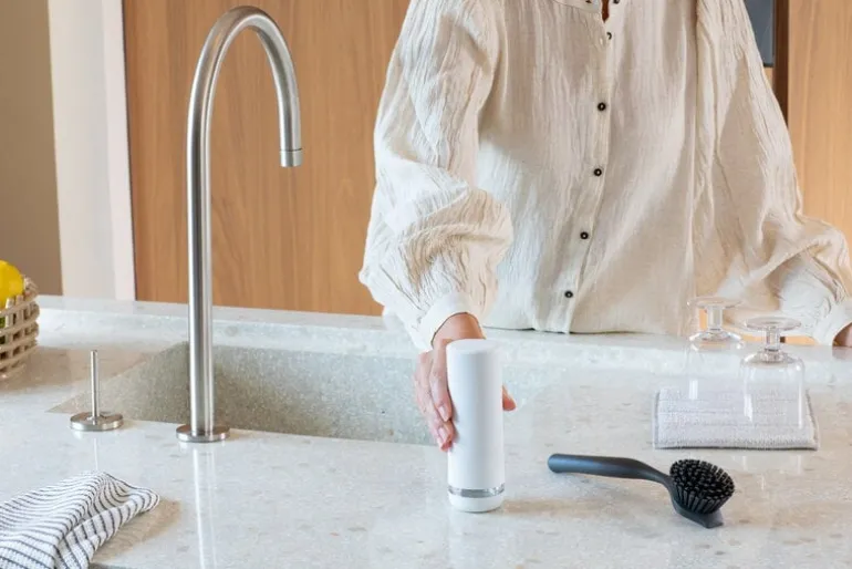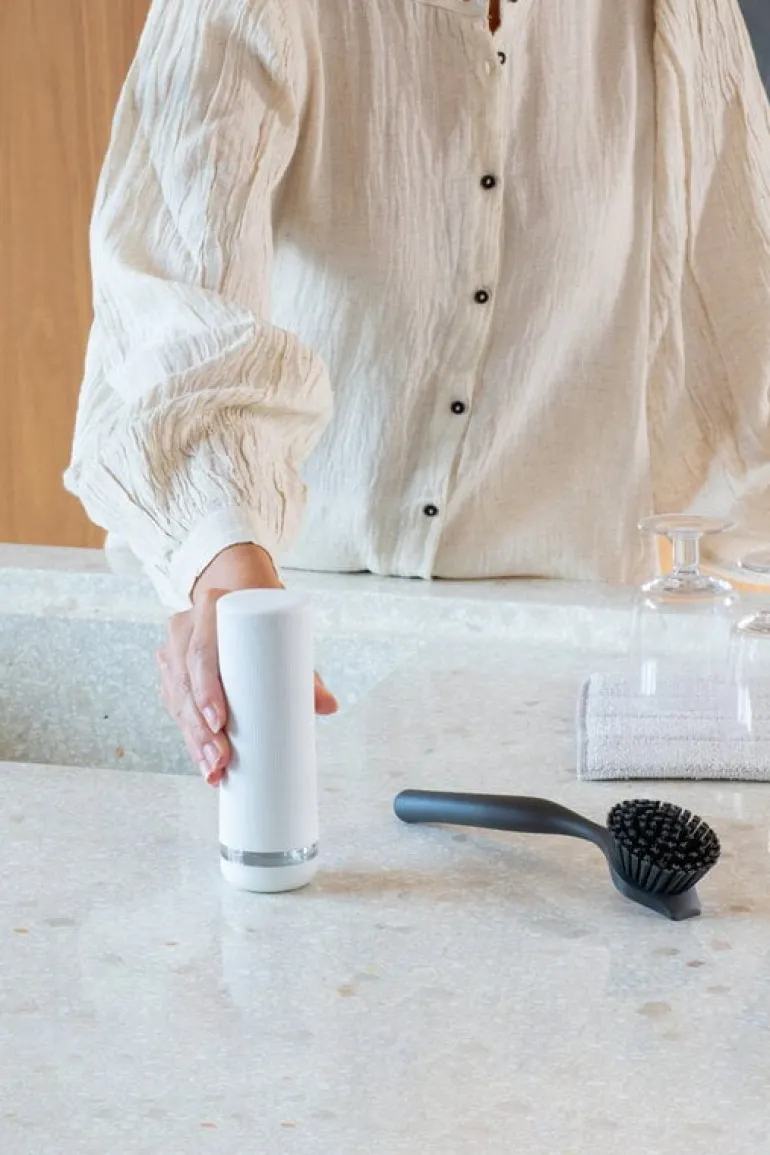SinkStyle diskmedelsdispenser från Brabantia är ett perfekt exempel på vardagsestetik! Denna minimalistiska diskmedelsdispenser gör ytan runt diskhon vackrare – och den delen av köket behöver ju ofta lite hjälp för att hålla stilen. Dessutom är dispensern bra för både plånboken och miljön, eftersom du kan använda den med refillpåsar.
