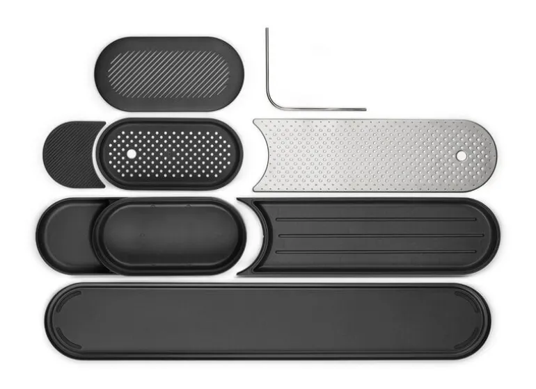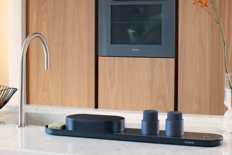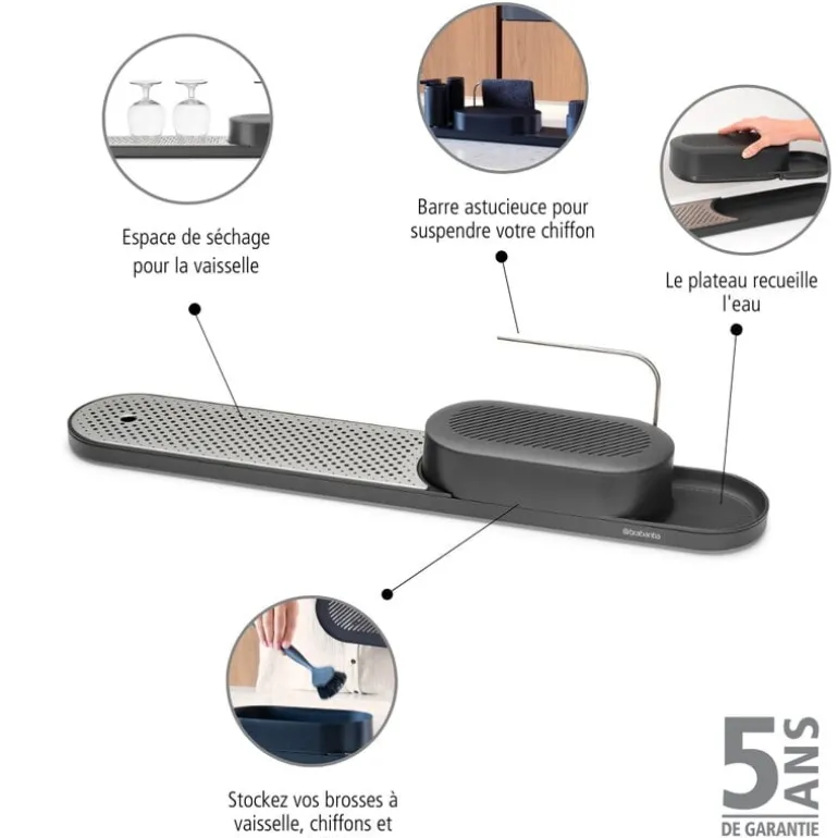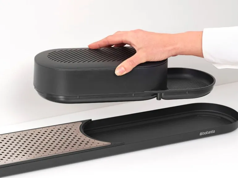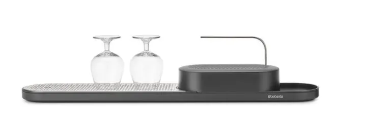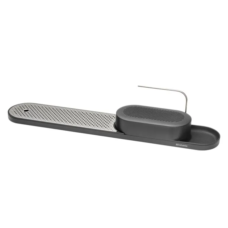 Redskapsstället och torkbrickan SinkStyle från Brabantia hjälper till att hålla ordning på redskap och flaskor i köket och badrummet i ett elegant, skandinaviskt minimalistiskt utförande. I det praktiska förvaringsstället ryms svampar, kökshanddukar och en diskborste, men där finns också en behändig stång där du kan hänga upp våta trasor på tork. Tack vare torkbrickan har du alltid pumptvålarna och diskmedelsflaskorna nära till hands. Undersidan av stället är belagd med silikon för att säkerställa att det står stadigt på plats på diskbänken.