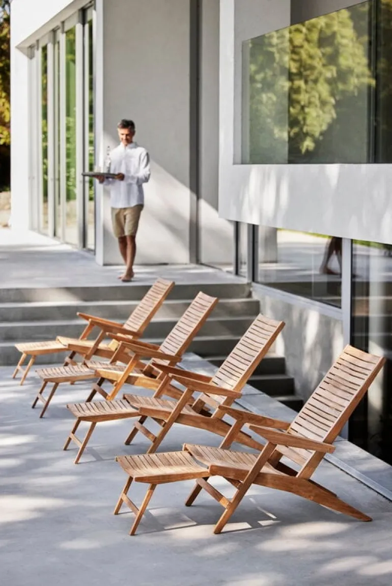 Flip däckstol från Cane-line, designad av den danska duon Strand+Hvass, är en uteplatsstol i teak med en skulptural design och ett distinkt säte som är lätt böjt i mitten. Tack vare den fällbara ryggstödet kan du enkelt justera sittvinkeln efter eget tycke, och fotstödet kan enkelt skjutas under sätet när det inte används.