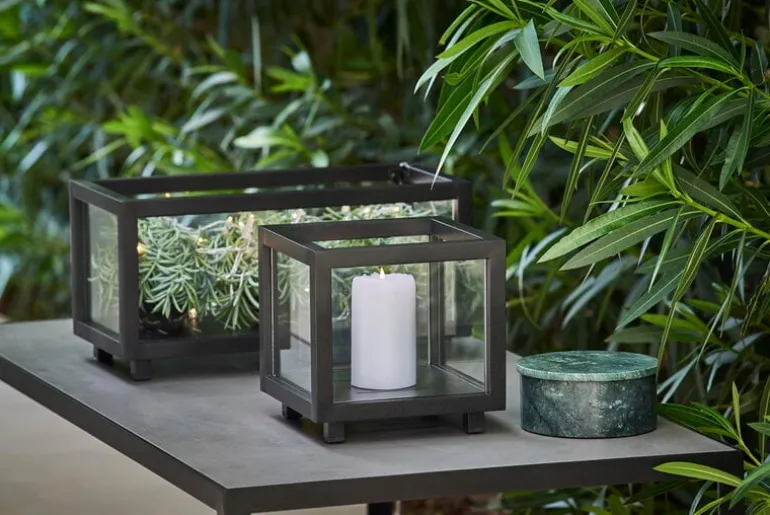 Cane-lines Lightbox är en modern multifunktionell glaslåda som kan användas som en lykta för ljus, en förvaringslåda samt en utomhuskruka eller ett mini-växthus för färska örter. Lightbox kubiska ram är tillverkad av reptåligt aluminium med hög ljusäkthet, och glasytorna är hållbart, härdat glas. Lightboxarna är stapelbara och kompatibla med Cane-lines Lighthouse-lyktor både till storlek och utseende.