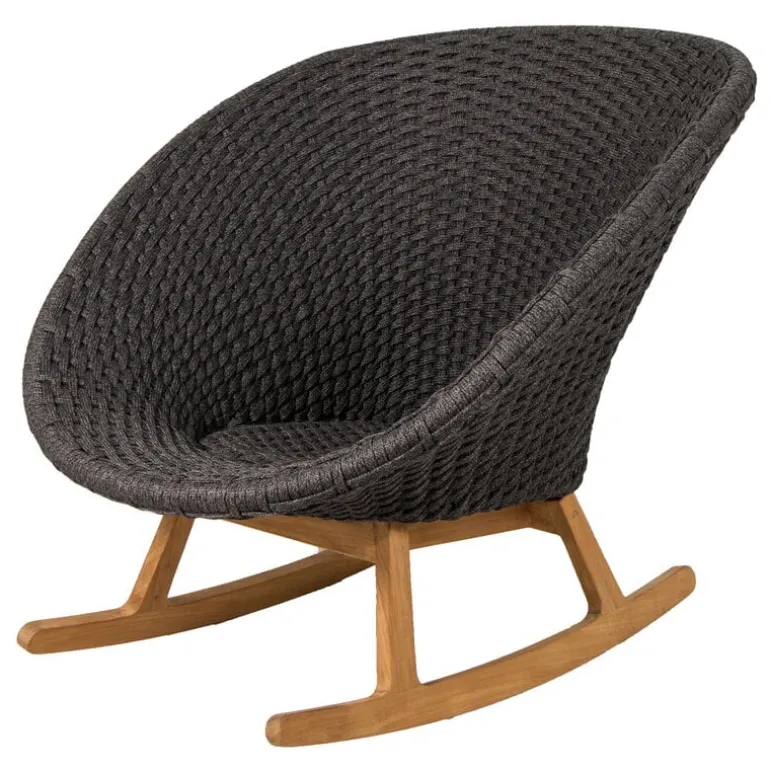 Peacock utomhusgungstol från Cane-line är ett fint exempel på tidlös dansk design, perfekt för uteplatsen, balkongen eller trädgården. Gungstolen, som är designad av Foersom & Hiort-Lorenzen, består av en bas i teakträ och en mjuk, flexibel sits i polypropen. Den koppformade sitsen är vävd av Cane-lines eget Soft Rope-material, som är särskilt utformat för utomhusbruk. Det mycket väderbeständiga materialet behåller sin färg och form i flera år, oavsett om det regnar eller skiner. Teakträbasen kommer långsamt att utveckla en vacker grå patina som är typisk för det naturliga materialet.
