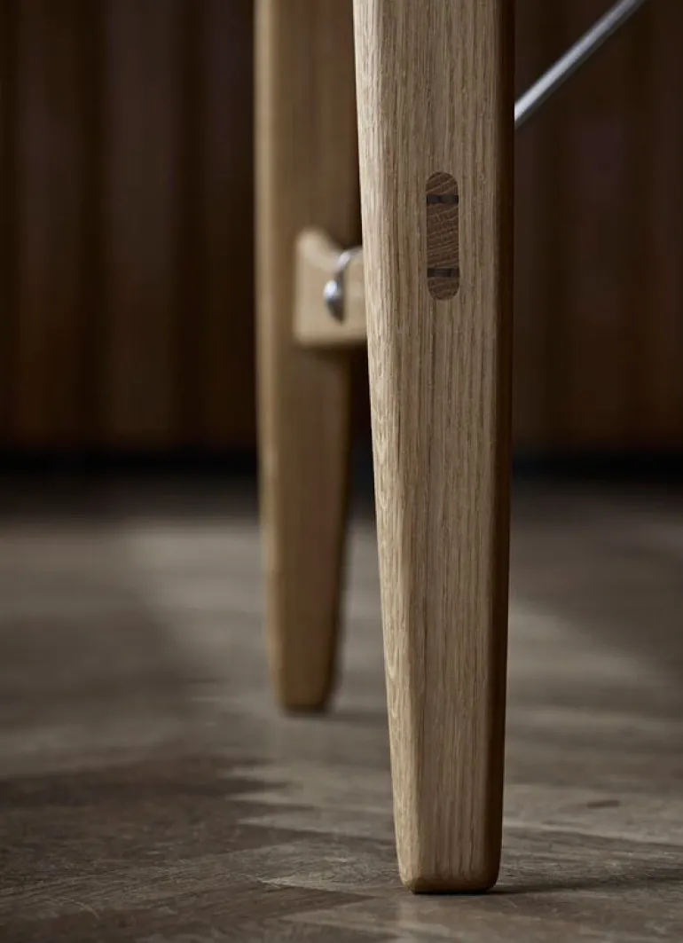 BM1160 Hunting-bordet är en fascinerande kombination av lyxiga och karaktärsfulla naturliga material. Den noggrant tillverkade massiva träramen med skicklig fogning kompletteras av metallstöd som löper under den fanerade bordsskivan, vilket säkerställer en stabil struktur. Tack vare den långa, smala bordsskivan är Hunting-bordet också lämpligt för större grupper, och är fortfarande lätt att passa in i ett litet utrymme. Handgjord i Danmark är Hunting-bordet en tidlös designklassiker som lätt hittar sin plats i moderna interiörer också.