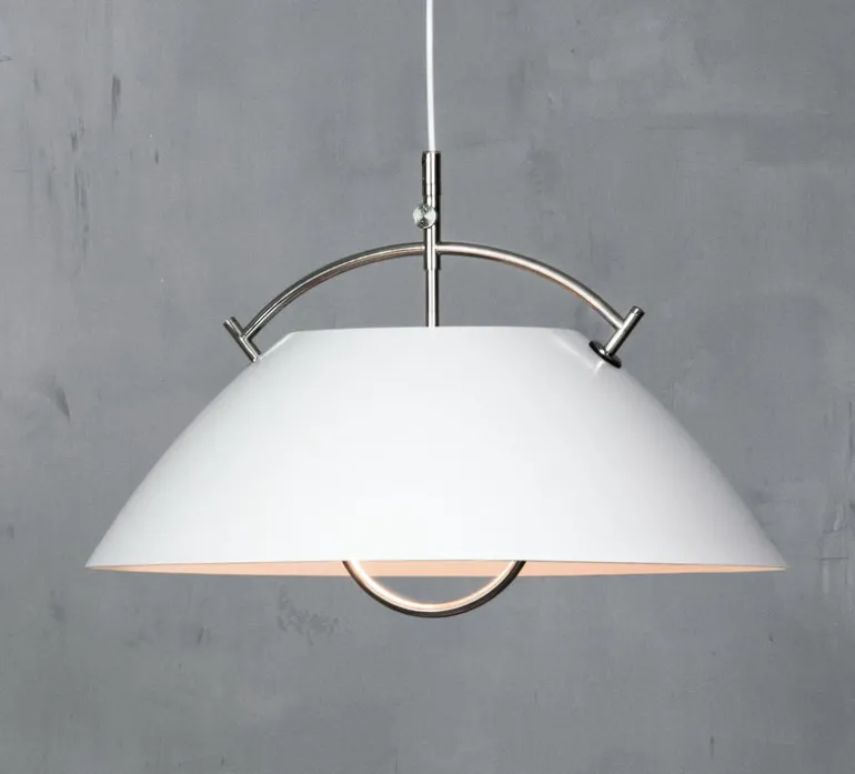 från Carl Hansen & Søn är en klassisk design från 1962 av Hans J. Wegner. ”The Pendant”, som lampan också kallas, har varit i kontinuerlig produktion sedan lanseringen och har under årens lopp uppnått status som en designikon – lampans framgång är ett bevis på Wegners skicklighet som ljusdesigner, även om han är mest känd för sina stoldesigner. Essensen i Wegners The Pendant ligger i det dekorativa handtaget som gör att lampan kan dras till önskad höjd utan att man behöver röra vid skärmen. Handtaget är inte bara funktionellt, utan utgör också en sofistikerad, distinkt detalj i pendellampans i övrigt ganska enkla design.