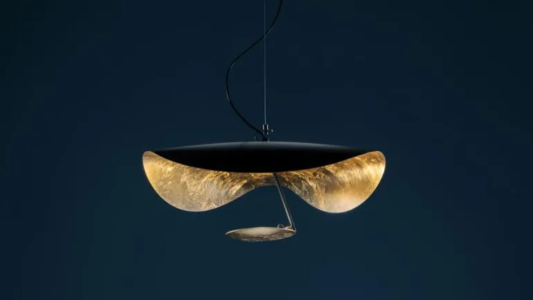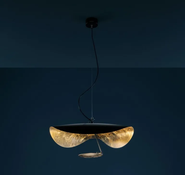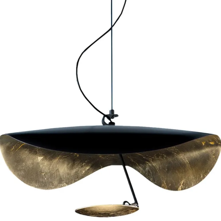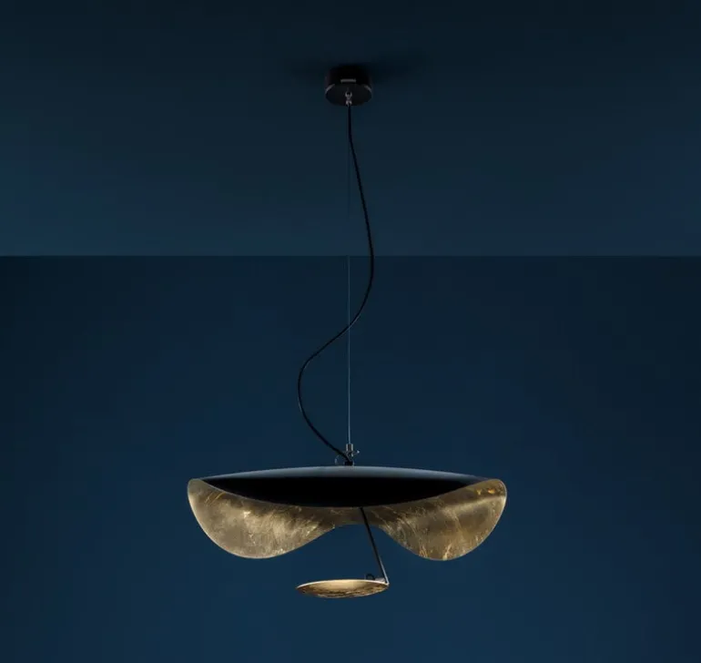 Catellani & Smiths pendellampa Lederam Manta S1 kombinerar en guld- och svartfärgad skärm, som påminner om en manta, med en rund, gyllene lampkropp placerad under den. I huvudet finns en integrerad, dimbar LED-modul som kastar ett mjukt, varmt sken som reflekteras av den gyllene ytan. Med sin slående, skulpterade form och bländfria belysning är pendellampan Lederam Manta idealisk för att lysa upp ett matbord eller loungeområde.