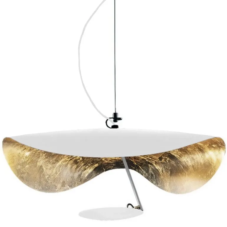 Catellani & Smiths pendellampa Lederam Manta S1 kombinerar en guld- och vitfärgad skärm, som påminner om en manta, med en rund, gyllene lampkropp placerad nedanför. I skärmen finns en integrerad, dimbar LED-modul som kastar ett mjukt, varmt sken som reflekteras av den gyllene ytan. Med sin slående, skulpterade form och bländfria belysning är pendellampan Lederam Manta idealisk att använda över matbordet eller i vardagsrummet.