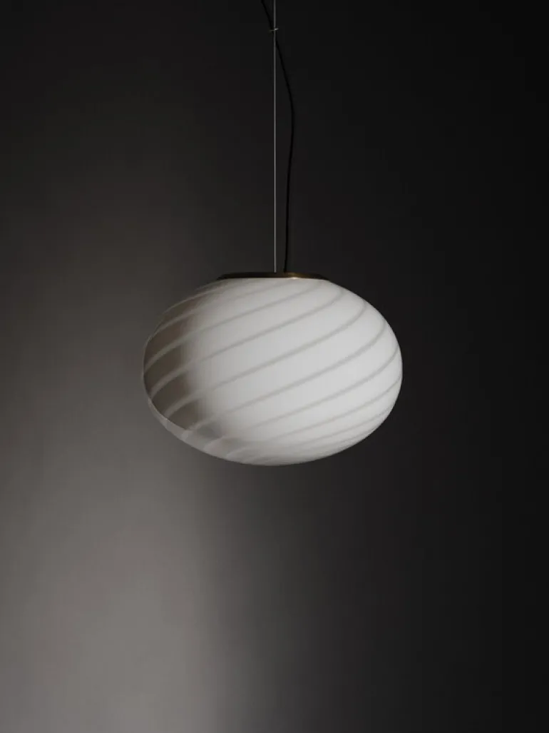 Copenhagen Venices pendel S35 Vetri Murano lyfter fram skönheten i italiensk glaskonst och för med sig en känsla av tidlös elegans in i rummet. Pendellampans delikata design framhävs av det virvlande mönstret på glasskärmen, som skapats med en originalform från 1970-talet och som sprider ett mjukt och stämningsfullt sken. En handgjuten mässingsinfattning ger lampan en raffinerad touch som fulländar dess eleganta framtoning.
