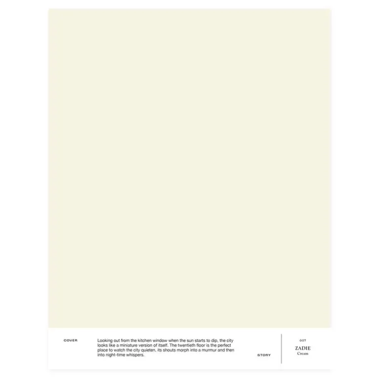 Inomhusfärgen 007 Zadie från Cover Story är en klassisk krämvit färg vars gula ton ger ett härligt värmande inslag i rummet. Den matta färgen ger en sammetslen, icke-reflekterande yta på den målade ytan.
