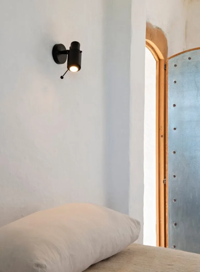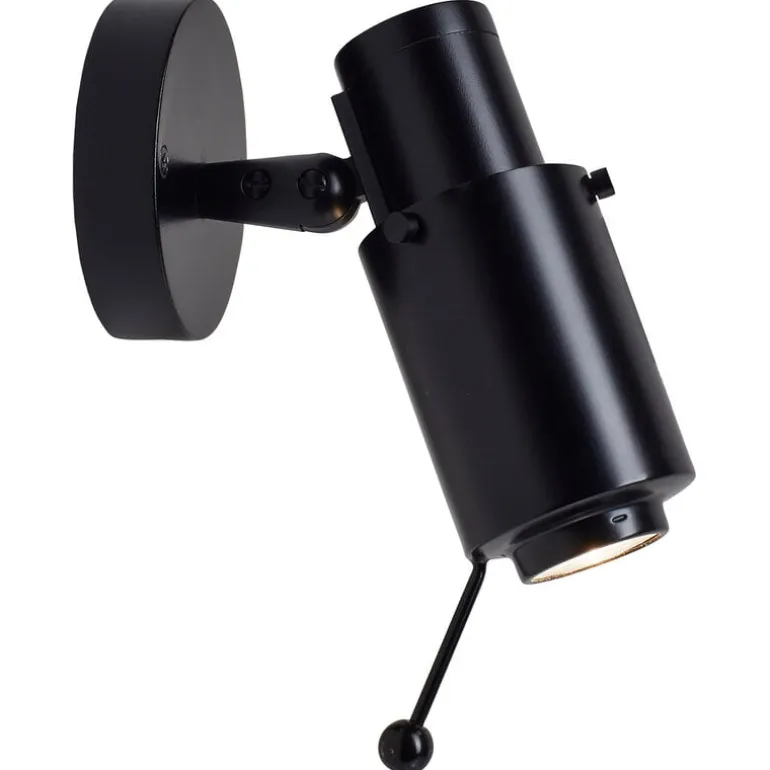 Biny Spot vägglampa kastar ett skarpt ljusstråle på ett specifikt område tack vare en kullager som lutar 88 grader och roterar 330 grader. Utseendet på den lilla och praktiska Biny Spot är avslutat med en spak med en klotknopp, och den har en fastmonterad väggfäste. Denna modell har inte en integrerad ljusströmbrytare.