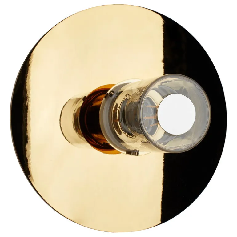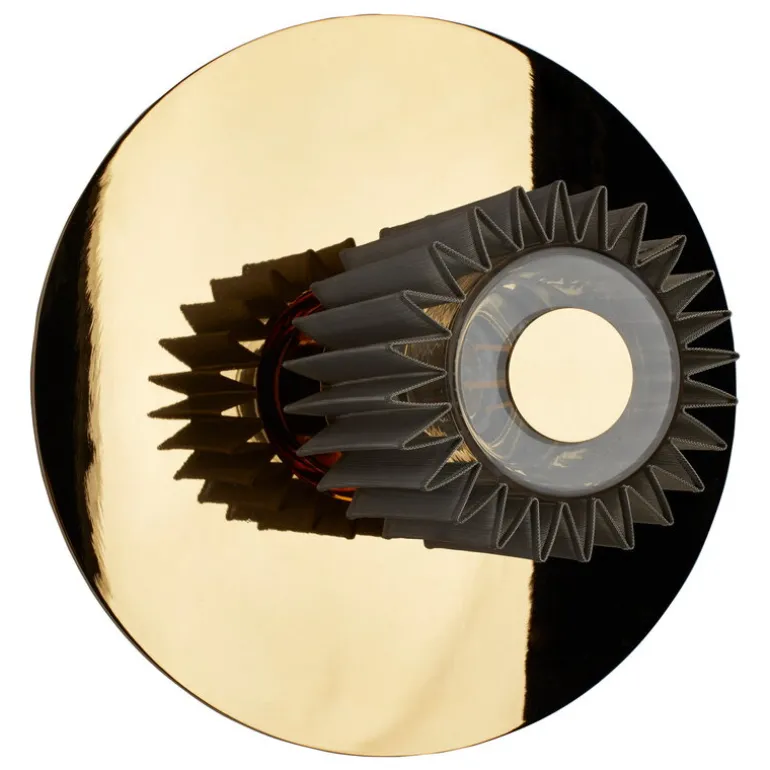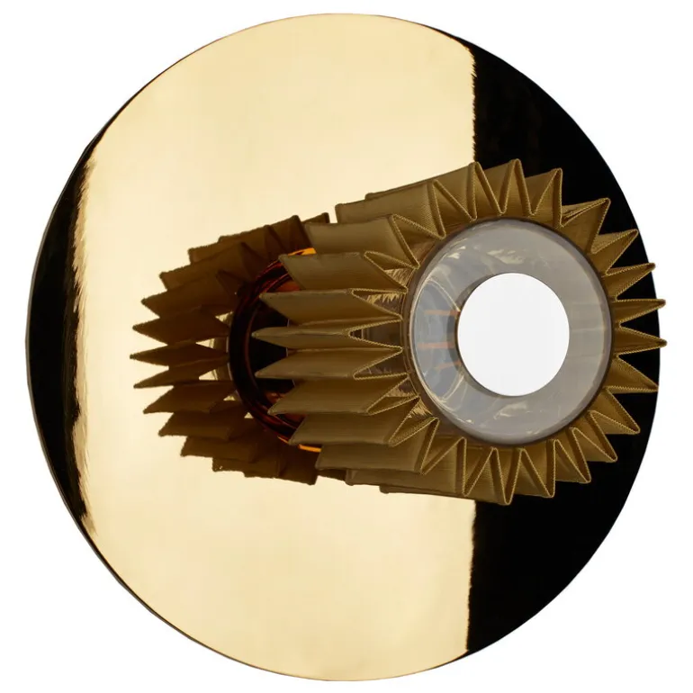 DCW éditions vägglampa In The Sun består av en stålbas och en fascinerande böjd metallskärm med mesh som gör att In The Sun inte bara skapar trivsam belysning, utan även en halo som påminner om solsken. Den guld- och silverfärgade lampan kan monteras på väggen eller i taket.