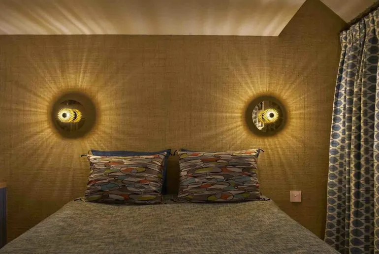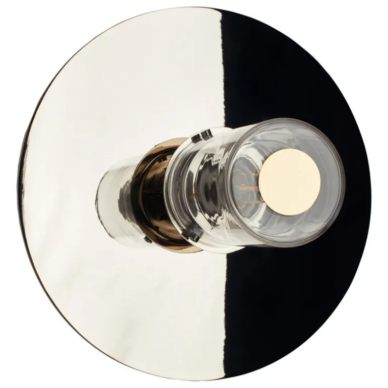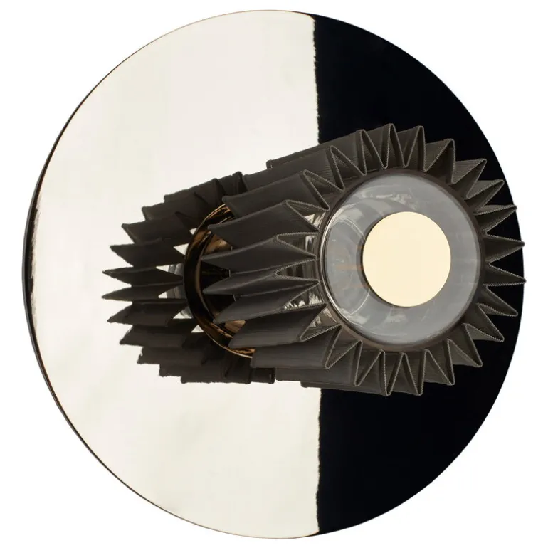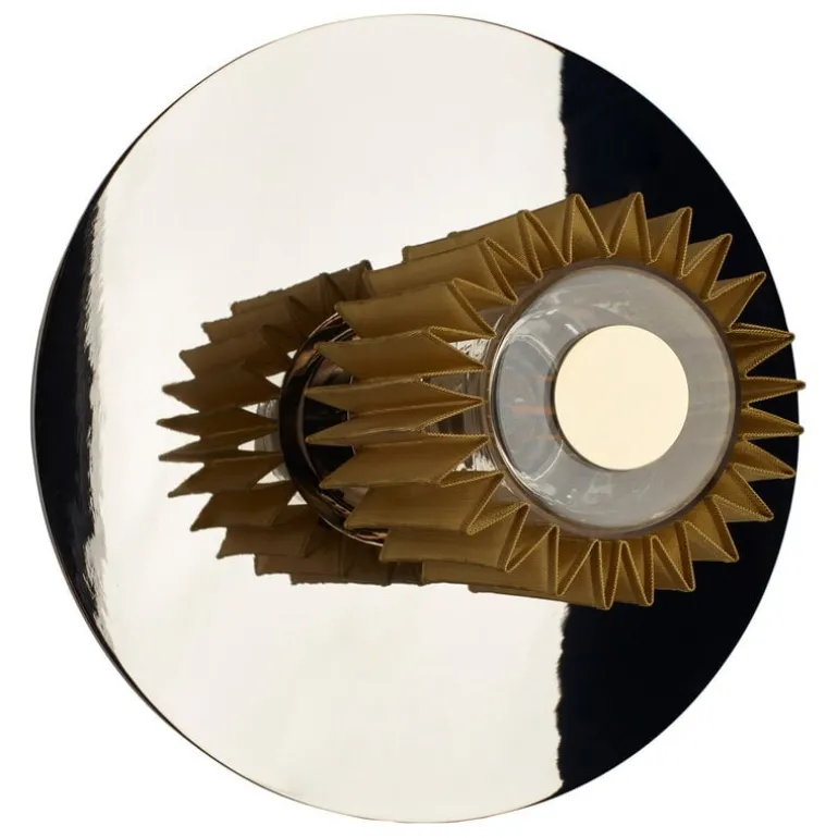 DCW éditions vägglampa In The Sun består av en stålbas och en fascinerande böjd metallskärm med mesh som gör att In The Sun inte bara skapar trivsam belysning, utan även en halo som påminner om solsken. Den silver- och guldfärgade lampan kan monteras på väggen eller i taket.