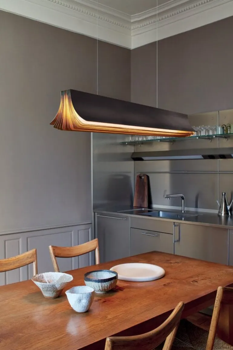 Respiro-pendellampan från DCW éditions, som designades av Philippe Nigro år 2019, har en fläktliknande struktur som påminner om sidorna i en öppen bok. Armaturen i aluminium hänger från två strängar, och är svart på utsidan medan insidan är guldfärgad. I hemmet passar Respiro-pendellampan perfekt ovanför till exempel matbordet eller köksön, medan dess dimbara stämningsfulla ljus även passar barer, restauranger och hotell.