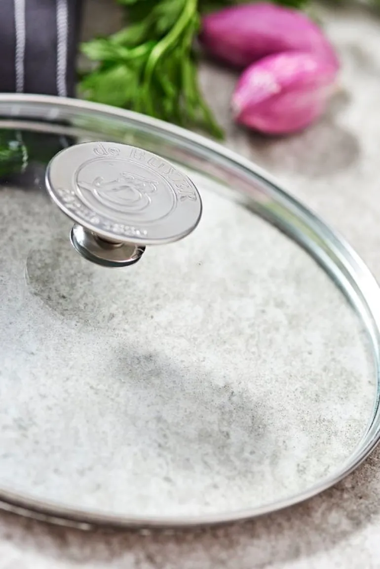 Glaslocket passar väl ihop med De Buyers 28 cm Choc Intense stekpanna och Choc Intense traktörpanna. Locket är ugnssäkert upp till 200 grader Celsius.