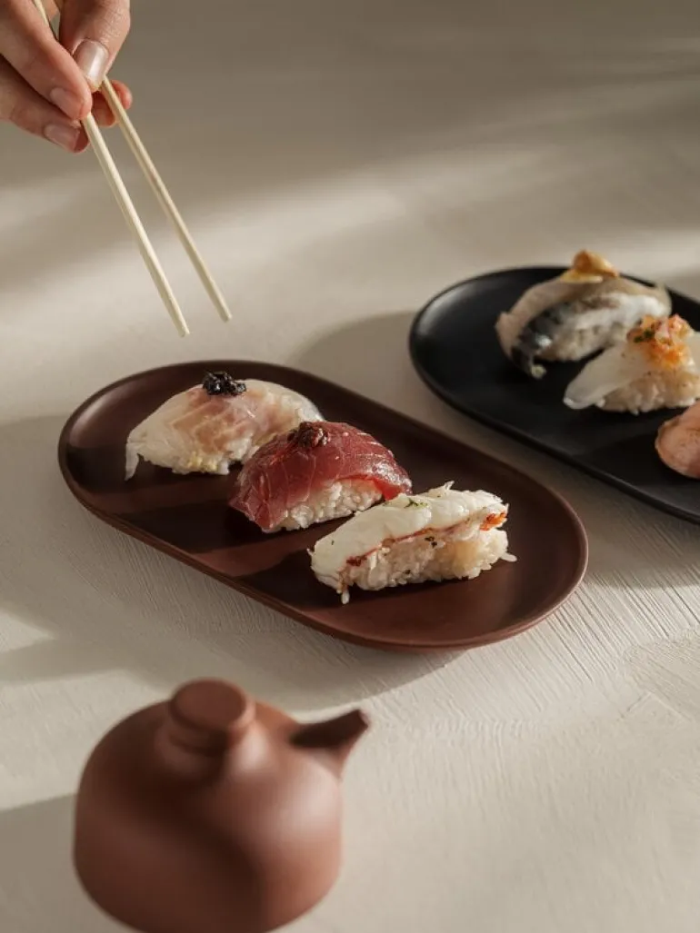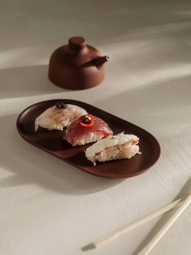 Sand Secrets-tallriken från Design House Stockholm är tillverkad av högbränt stengods. Du kan använda den ovala tallriken för att servera ost eller sushi, men den förenklade tallriken hittar också sin plats utanför köket: den kan användas som en bricka för kosmetikburkar i badrummet eller små dekorativa föremål i hallen.