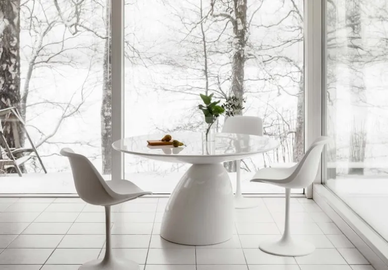I matbordet Parabel har Eero Aarnio arbetat med sitt favoritmaterial, glasfiber. Det enda materialet som tillåter en så pass fri och uttrycksfull design – återigen har han skapat en skulptur. Det finns bara några hållbara och lättskötta material som tillåter den här typen av formgivning, samtidigt som det uppfyller alla krav som ställs på en bordsyta.