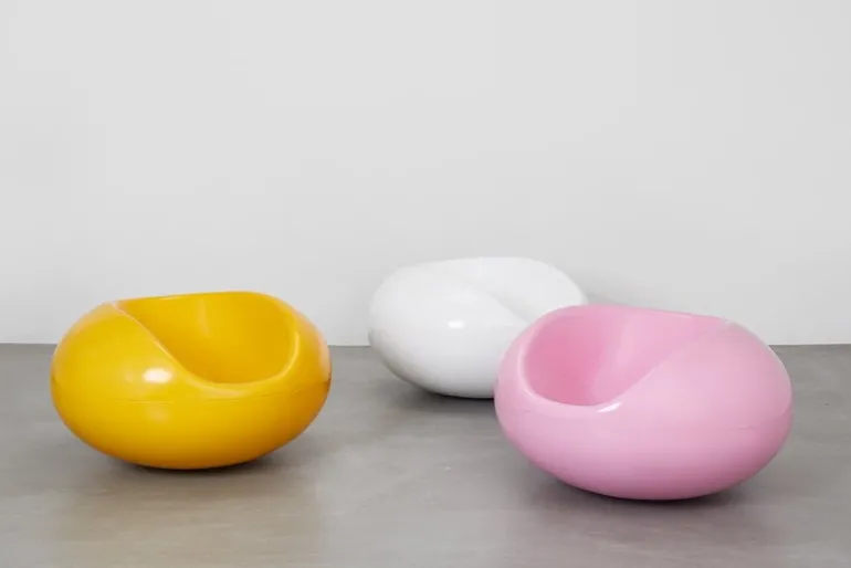 Eero Aarnios stol Pastill är en rolig och modern designklassiker från 1967. Pastill påminner om en blank karamell i oversize, stolen gungar lätt och är fantastiskt bekväm – och rolig – att sitta på. Den lekfulla formen och härliga färgen gör Pastill till ett blickfång i rummet. Stolen är tillverkad i glasfiber och fungerar därför lika bra utomhus.