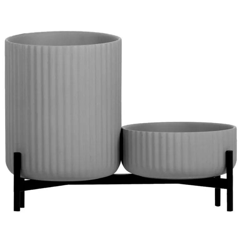 Elementas Klorofyll blomkruksstativ består av två blomkrukor och en bred bas som tillsammans ger en elegant inramning för en mängd olika krukväxter. De grå krukorna är gjorda av betong och det enkla geometriska stativet är tillverkat av svart pulverlackerat metall.