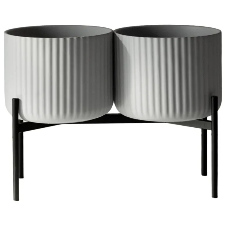 Elementas Klorofyll växtstativ består av två blomkrukor och en bred bas som tillsammans ger en elegant inramning för en mängd olika krukväxter. De grå krukorna är gjorda av betong och det enkla geometriska stativet är tillverkat av svart pulverlackerat metall.