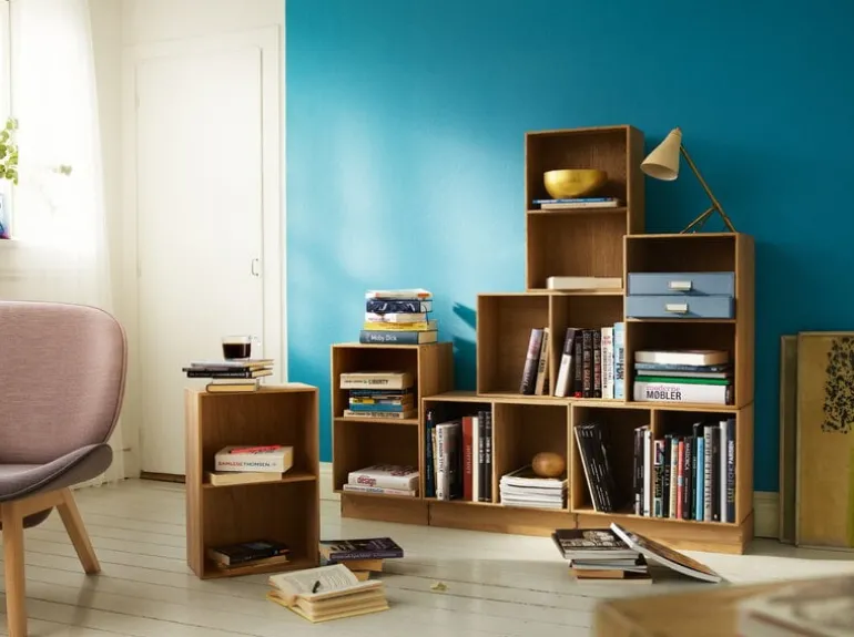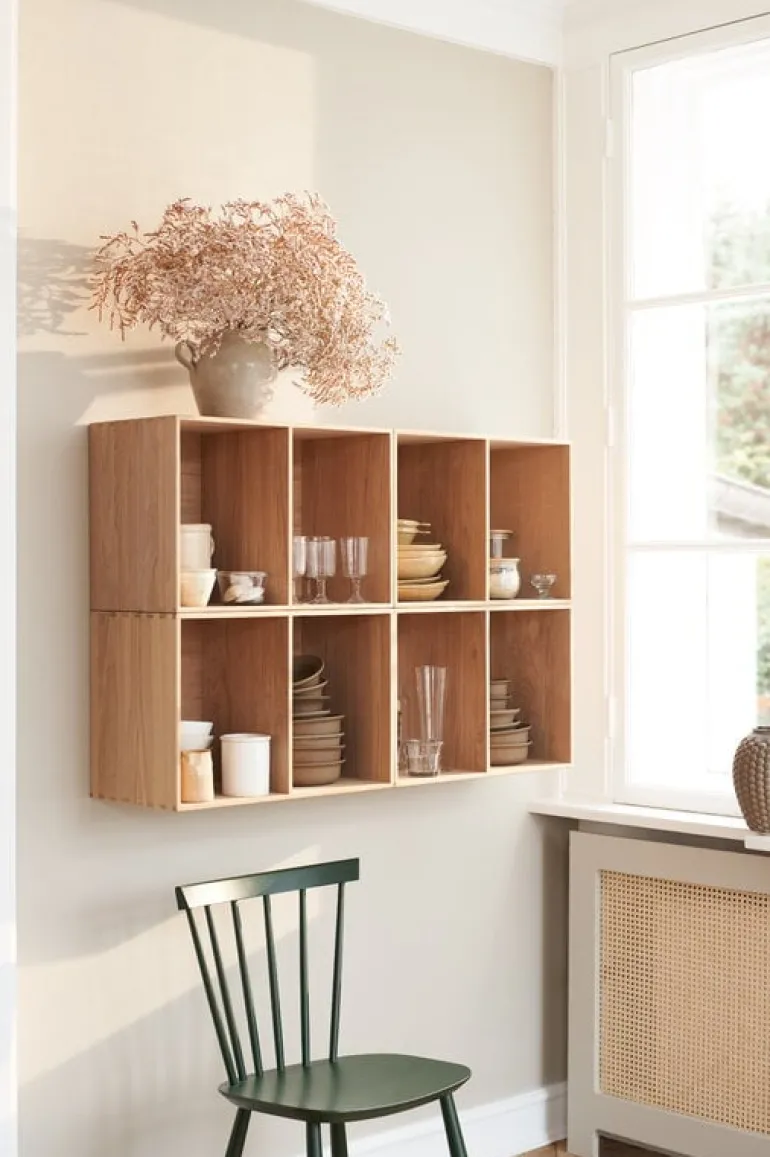 Bokhyllan B98 från FDB Møbler är en praktiskt storlek på en öppen hylla tillverkad av lackad massiv ek. Designad av Mogens Koch och först släppt 1944, baseras B98-kollektionen på modulära, multifunktionella hyllor som kan användas antingen individuellt eller i grupper, vertikalt eller horisontellt, monterade på väggen eller fristående på golvet – valet är ditt.