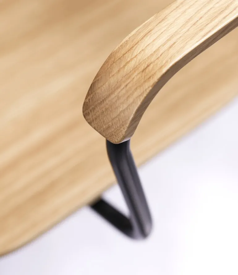 Med sits, armstöd och ryggstöd i ekfaner vilar J183 Holmen på eleganta metallben, och stolen är därmed en perfekt kombination av elegans och slitstyrka. Den lätta, stapelbara designen gör stolen praktisk i matrum och kök, där den passar till alla matbord. J183 Holmen är också en vacker inredningsdetalj i hemmakontoret eller som en mysig extrastol i vardagsrummet.