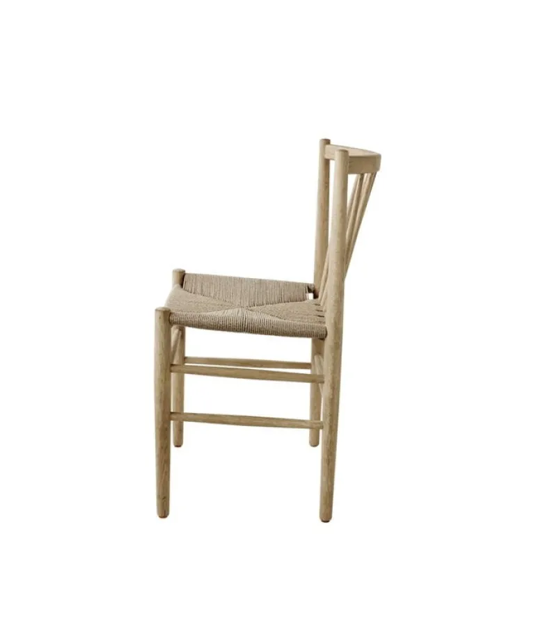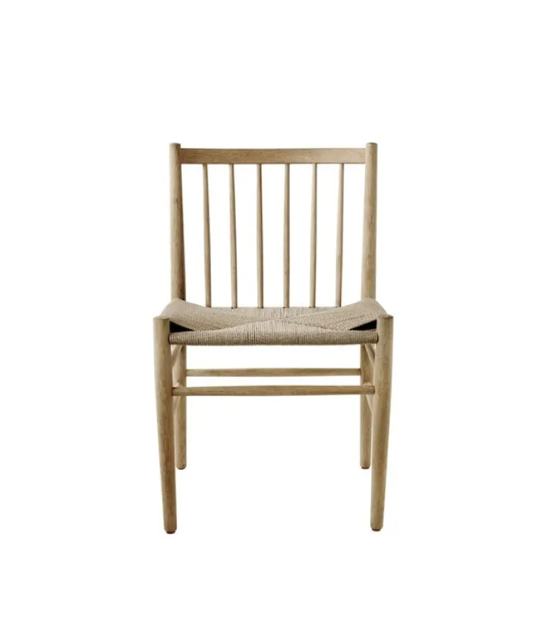 Stolen J80 från FDB Møbler, designad av Jørgen Bækmark, är en vacker pinnstol i trä från 1950-talet. Med sin kantiga ram och distinkta, rundade ryggstöd är denna stol i massiv ek en dansk designikon från mitten av 1900-talet. Sitsen i pappersgarn kompletterar stolens naturliga look, och dess funktionella form passar olika stilar och utrymmen. Stolen J80 och övriga stolar, bänkar och pallar i kollektionen J80 använder liknande material och är lika varandra till utseendet.