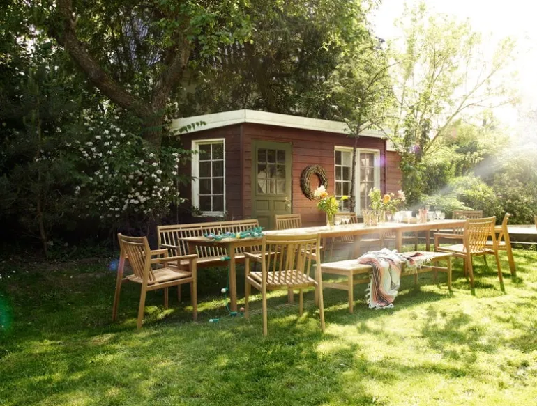 FDB Møblers utemöbler Sammen utstrålar både skickligt hantverk och minimalistisk nordisk elegans, helt i linje med det danska varumärkets traditioner. Formgivaren Thomas E. Alkens mål var att skapa ett möbelset för uteplatsen som håller samma höga nivå av kvalitet och stil som FDB Møblers inomhusmöbler, varför han valde teakträ som material för möblerna. Det tidlösa och slitstarka naturmaterialet åldras vackert och utvecklar en ljuvlig patina med tiden, då dess gyllenbruna nyans går över till en vacker silvergrå. Den ursprungliga färgen kan dock bibehållas om man skyddar möblerna och oljar in dem regelbundet. Teakträ som tas om hand ordentligt håller i många år.