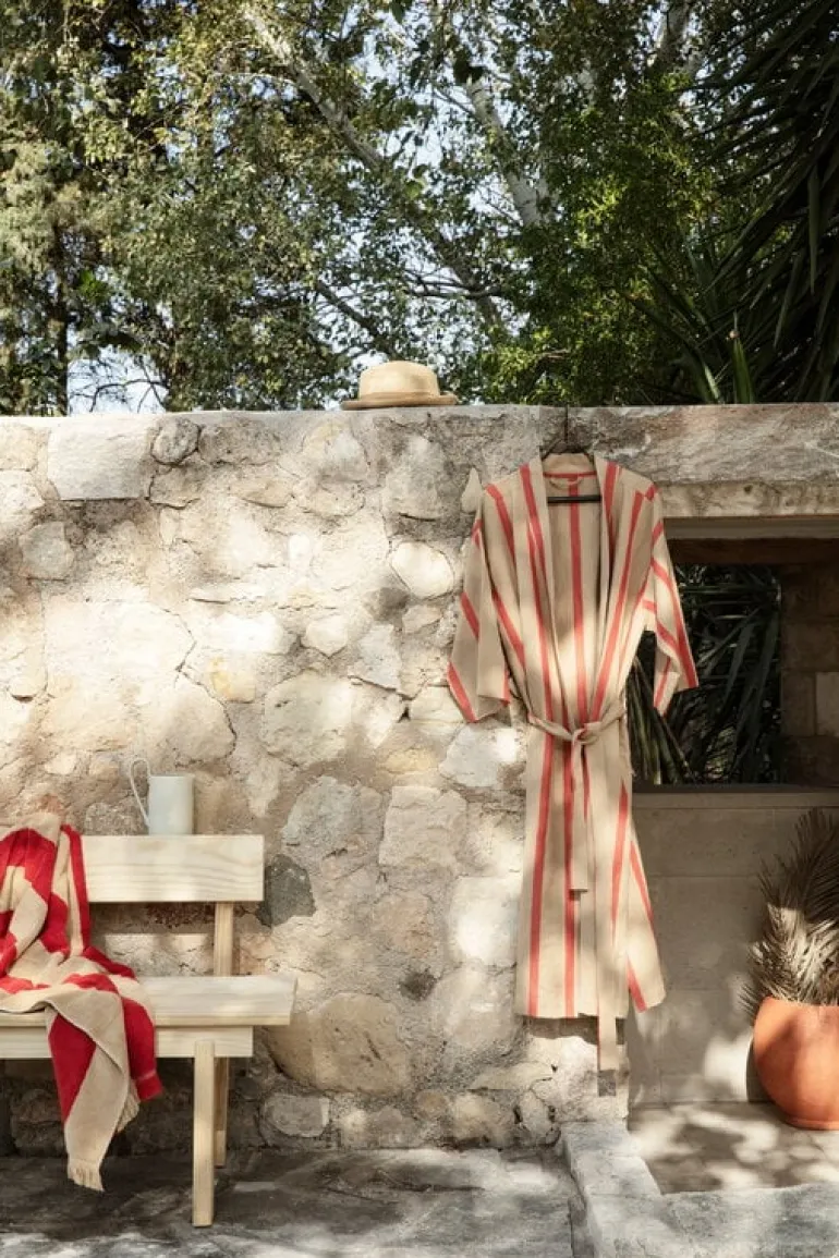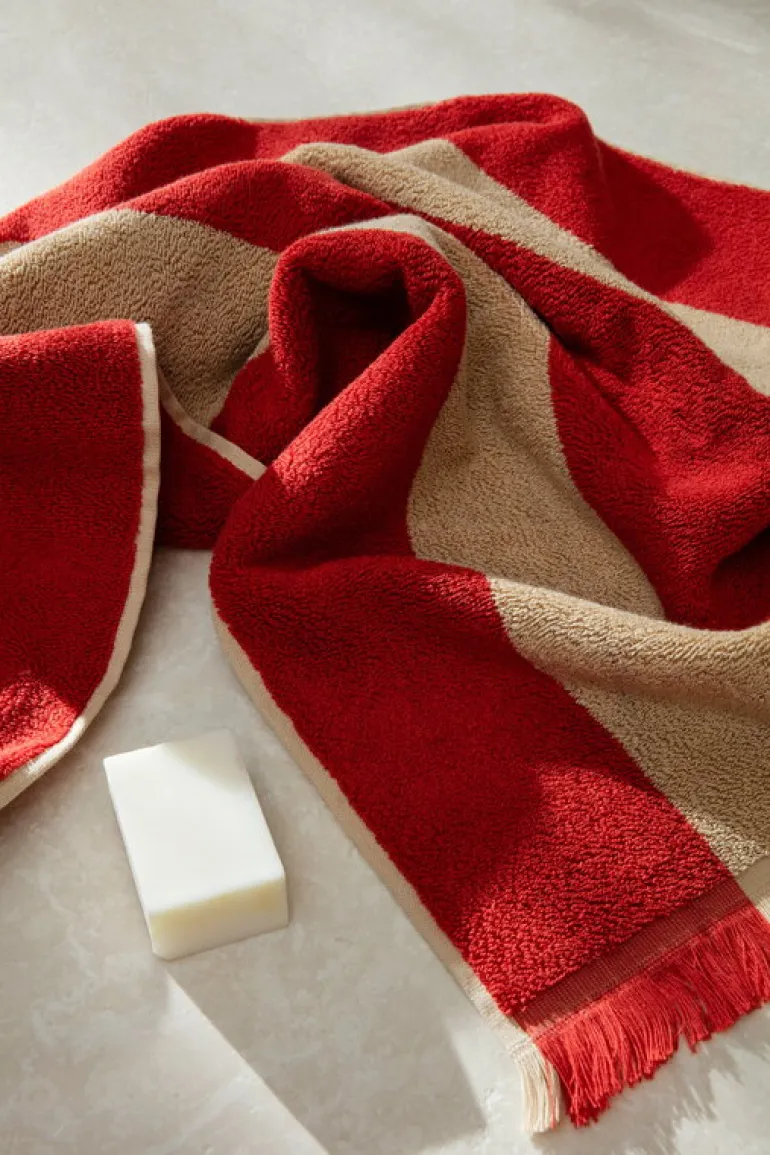 Ferm LIVING:s Alee badhandduk ger ett inslag av sofistikerad avslappning till badrumsinredningen – den plyschiga handduken är också perfekt för alla soliga dagar på stranden. Det uppfriskande randiga mönstret piggar upp utrymmet och de lättsamma fransarna ger en karismatisk finish till Alee-handduken, som är tillverkad av ekologisk bomull.