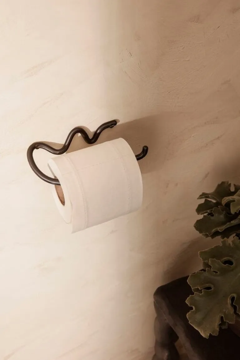 Ferm Livings toalettpappershållare Curvature ger en känsla av lyx och funktionalitet till ett modernt badrum. Produkterna i Curvature-serien är tillverkade av mässing med lekfulla kurvor som skapar mjuka nyanser i det hårda materialet. Krokarna är handtillverkade med antingen en matt eller svart patina-finish och alla produkter är unika.