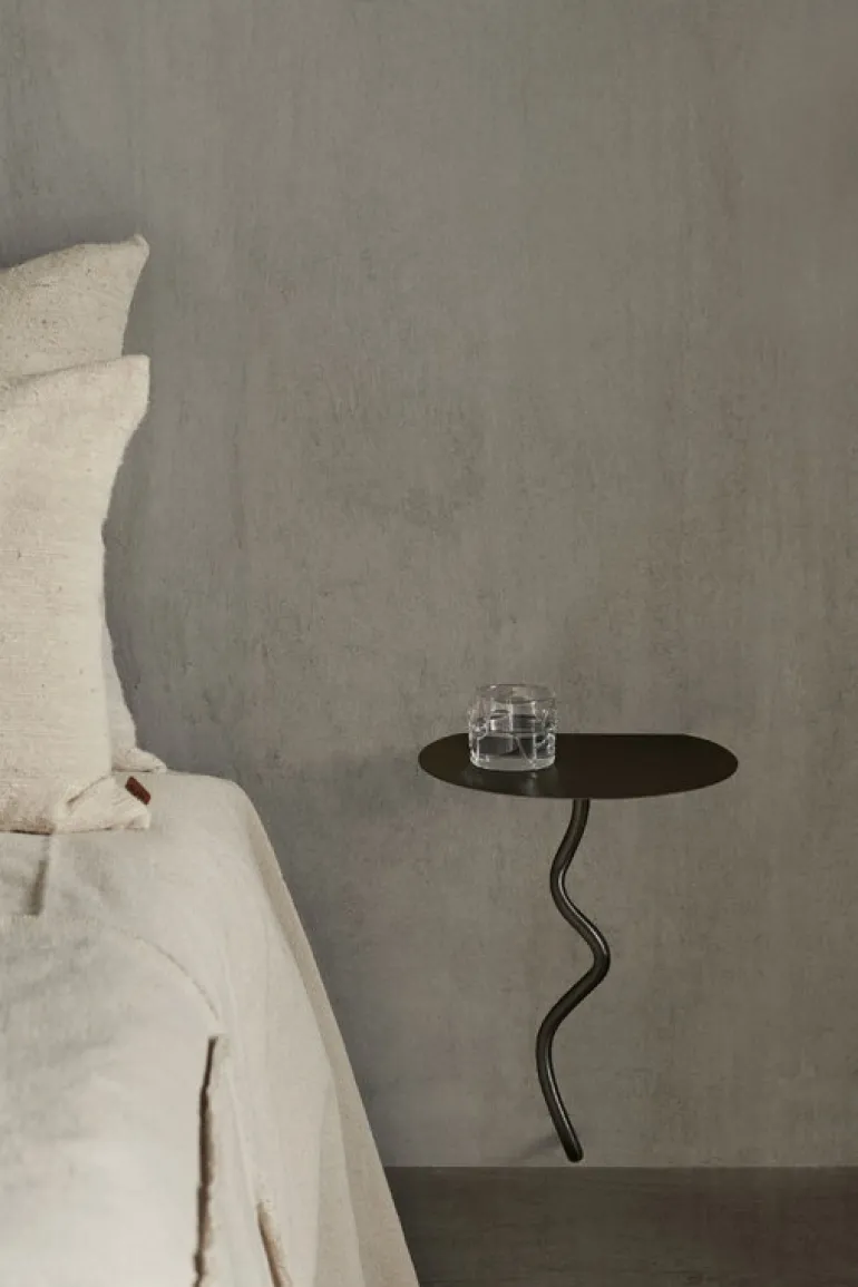 I väggbordet Curvature från ferm LIVING förenas både skönhet och funktion. Den väggmonterade hyllan kan användas som ett skulpterat sidobord i hallen eller vardagsrummet, eller som ett raffinerat nattygsbord i sovrummet. Produkterna i ferm LIVING:s Curvature-kollektion är tillverkade av mässing och har böjts på ett lekfullt sätt som bildar mjuka kontraster till det hårda materialet. Krokarna är handtillverkade med antingen en matt eller svart patina-finish och alla produkter är unika.